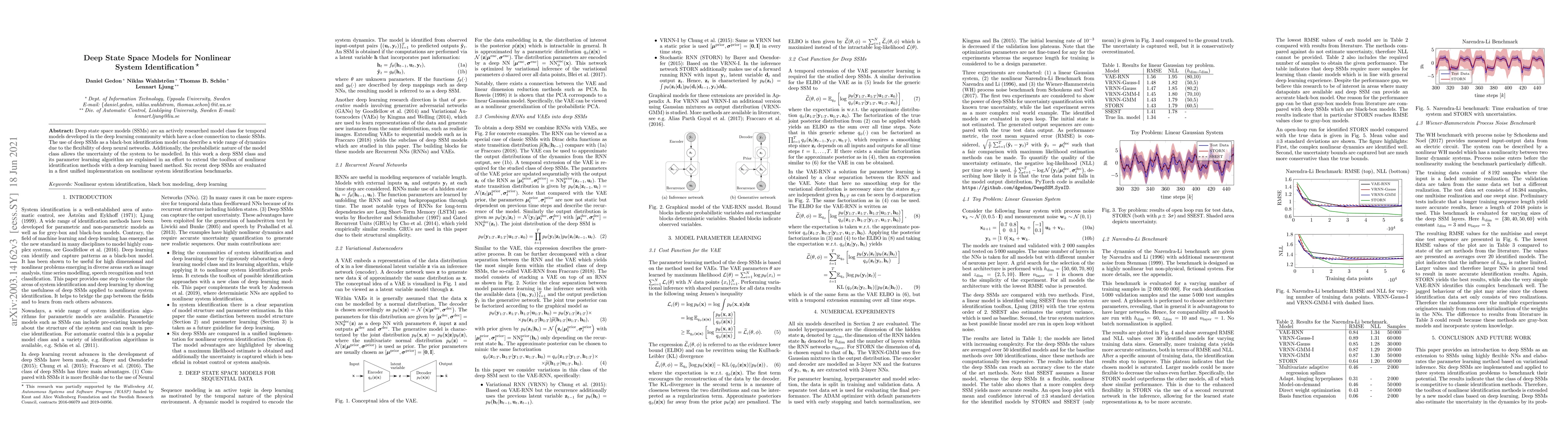 This paper introduces deep state space models (SSMs) for nonlinear system identification, leveraging the flexibility of deep neural networks to model a wide range of dynamic systems. The probabilistic nature of deep SSMs allows for modeling system uncertainties, and the paper evaluates six recent deep SSMs on nonlinear benchmarks to extend the toolbox of identification methods.