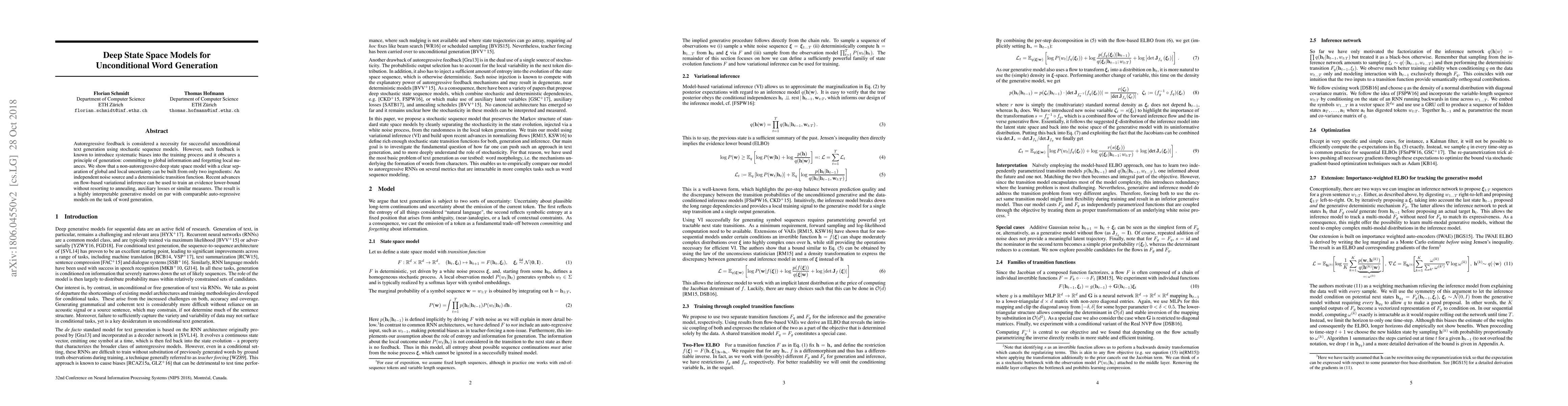 Autoregressive feedback is considered a necessity for successful unconditional text generation using stochastic sequence models. However, such feedback is known to introduce systematic biases into the training process and it obscures a principle of generation: committing to global information and forgetting local nuances. We show that a non-autoregressive deep state space model with a clear separation of global and local uncertainty can be built from only two ingredients: An independent noise source and a deterministic transition function. Recent advances on flow-based variational inference can be used to train an evidence lower-bound without resorting to annealing, auxiliary losses or similar measures. The result is a highly interpretable generative model on par with comparable auto-regressive models on the task of word generation.