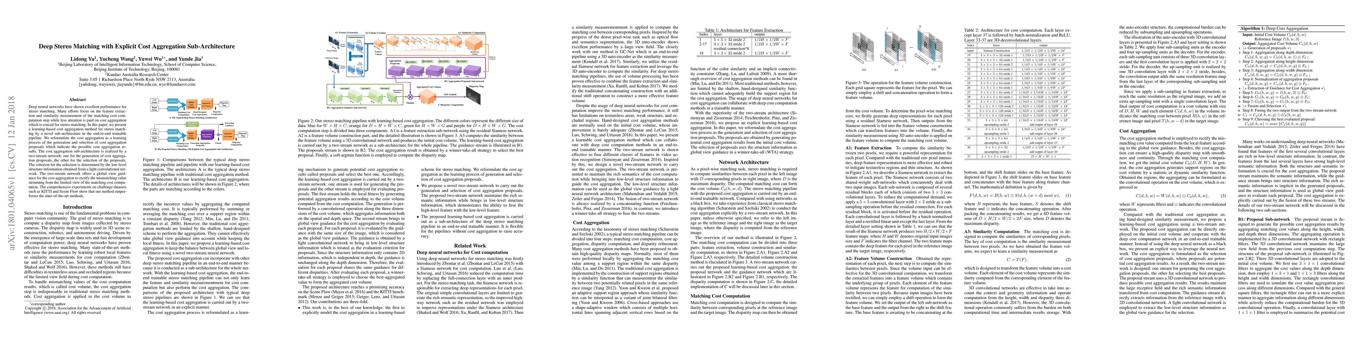 This paper introduces a novel learning-based cost aggregation sub-architecture for deep stereo matching, focusing on improving the cost aggregation process. The proposed method uses a two-stream network to generate and select cost aggregation proposals, guided by low-level structure information, achieving superior performance on datasets like KITTI and Scene Flow.
