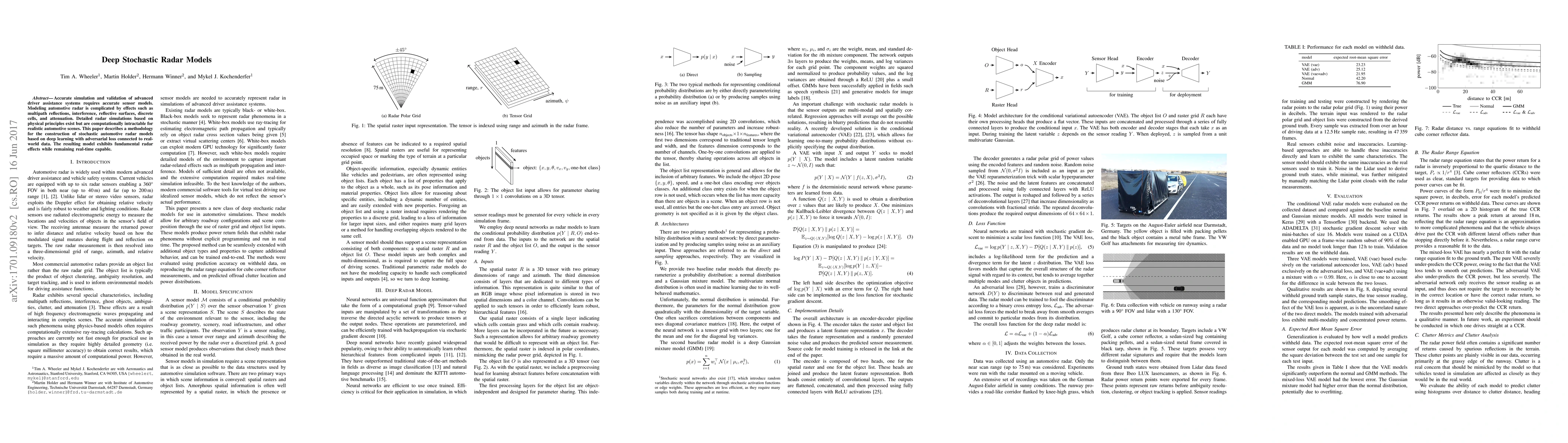 Accurate simulation and validation of advanced driver assistance systems requires accurate sensor models. Modeling automotive radar is complicated by effects such as multipath reflections, interference, reflective surfaces, discrete cells, and attenuation. Detailed radar simulations based on physical principles exist but are computationally intractable for realistic automotive scenes. This paper describes a methodology for the construction of stochastic automotive radar models based on deep learning with adversarial loss connected to real-world data. The resulting model exhibits fundamental radar effects while remaining real-time capable.