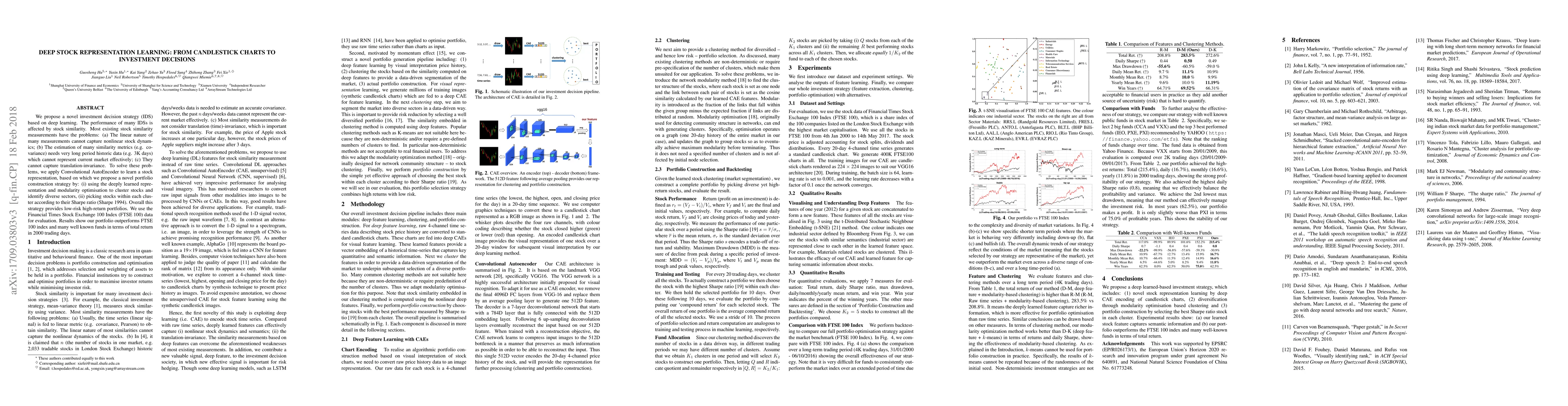 This paper proposes a deep learning-based investment decision strategy that uses Convolutional AutoEncoders to learn stock representations, addressing issues with existing stock similarity metrics. It clusters stocks and selects them based on the Sharpe ratio, resulting in low-risk, high-return portfolios that outperform the FTSE 100 index and other funds over 2000 trading days.