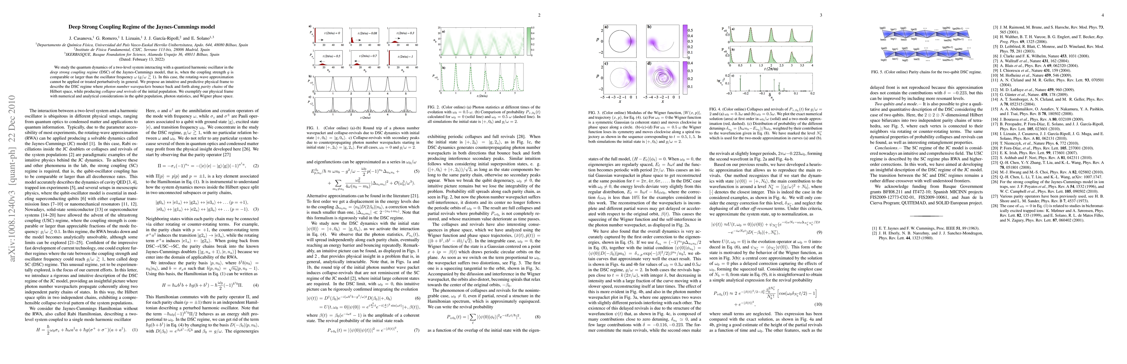 We study the quantum dynamics of a two-level system interacting with a quantized harmonic oscillator in the deep strong coupling regime (DSC) of the Jaynes-Cummings model, that is, when the coupling strength g is comparable or larger than the oscillator frequency w (g/w > 1). In this case, the rotating-wave approximation cannot be applied or treated perturbatively in general. We propose an intuitive and predictive physical frame to describe the DSC regime where photon number wavepackets bounce back and forth along parity chains of the Hilbert space, while producing collapse and revivals of the initial population. We exemplify our physical frame with numerical and analytical considerations in the qubit population, photon statistics, and Wigner phase space.