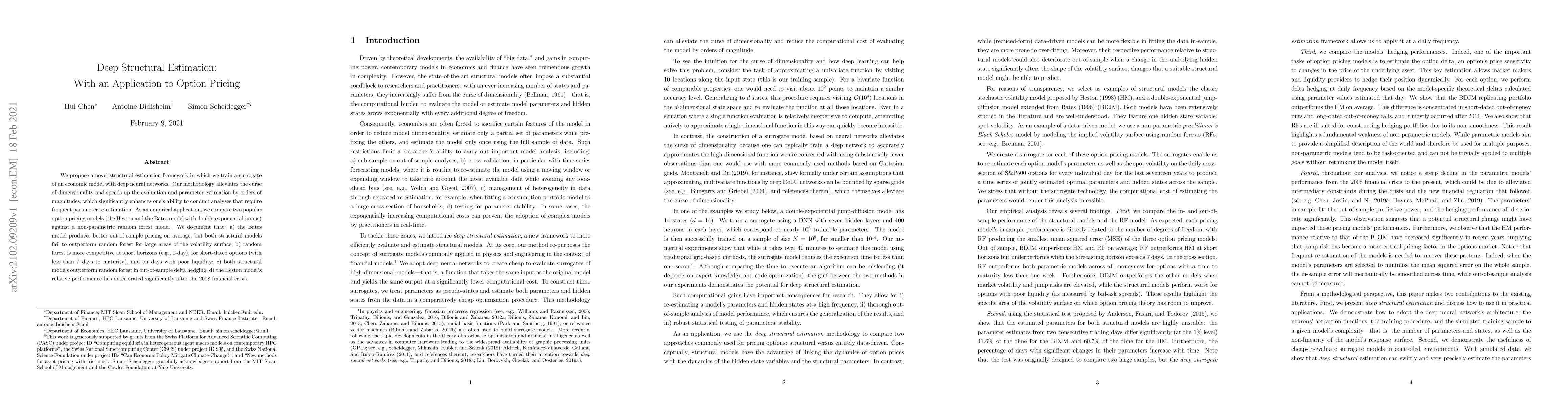We propose a novel structural estimation framework in which we train a surrogate of an economic model with deep neural networks. Our methodology alleviates the curse of dimensionality and speeds up the evaluation and parameter estimation by orders of magnitudes, which significantly enhances one's ability to conduct analyses that require frequent parameter re-estimation. As an empirical application, we compare two popular option pricing models (the Heston and the Bates model with double-exponential jumps) against a non-parametric random forest model. We document that: a) the Bates model produces better out-of-sample pricing on average, but both structural models fail to outperform random forest for large areas of the volatility surface; b) random forest is more competitive at short horizons (e.g., 1-day), for short-dated options (with less than 7 days to maturity), and on days with poor liquidity; c) both structural models outperform random forest in out-of-sample delta hedging; d) the Heston model's relative performance has deteriorated significantly after the 2008 financial crisis.