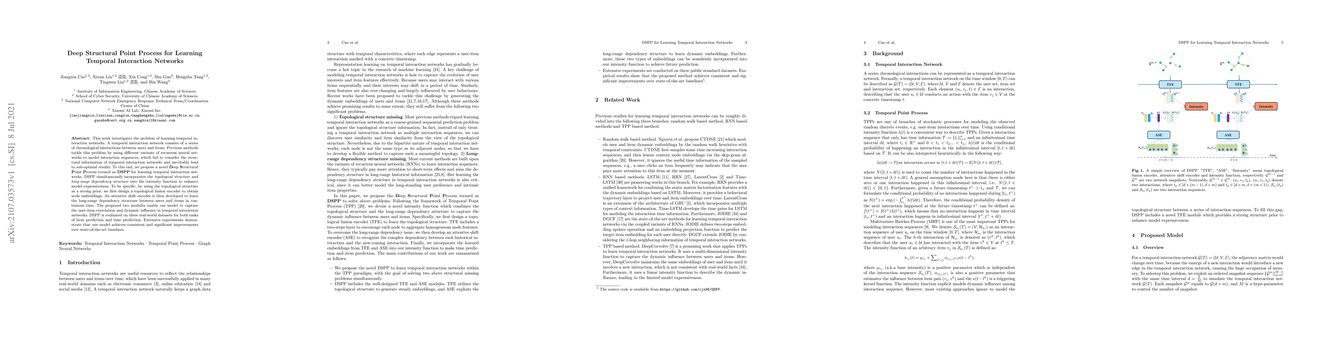 This work investigates the problem of learning temporal interaction networks. A temporal interaction network consists of a series of chronological interactions between users and items. Previous methods tackle this problem by using different variants of recurrent neural networks to model sequential interactions, which fail to consider the structural information of temporal interaction networks and inevitably lead to sub-optimal results. To this end, we propose a novel Deep Structural Point Process termed as DSPP for learning temporal interaction networks. DSPP simultaneously incorporates the topological structure and long-range dependency structure into our intensity function to enhance model expressiveness. To be specific, by using the topological structure as a strong prior, we first design a topological fusion encoder to obtain node embeddings. An attentive shift encoder is then developed to learn the long-range dependency structure between users and items in continuous time. The proposed two modules enable our model to capture the user-item correlation and dynamic influence in temporal interaction networks. DSPP is evaluated on three real-world datasets for both tasks of item prediction and time prediction. Extensive experiments demonstrate that our model achieves consistent and significant improvements over state-of-the-art baselines.