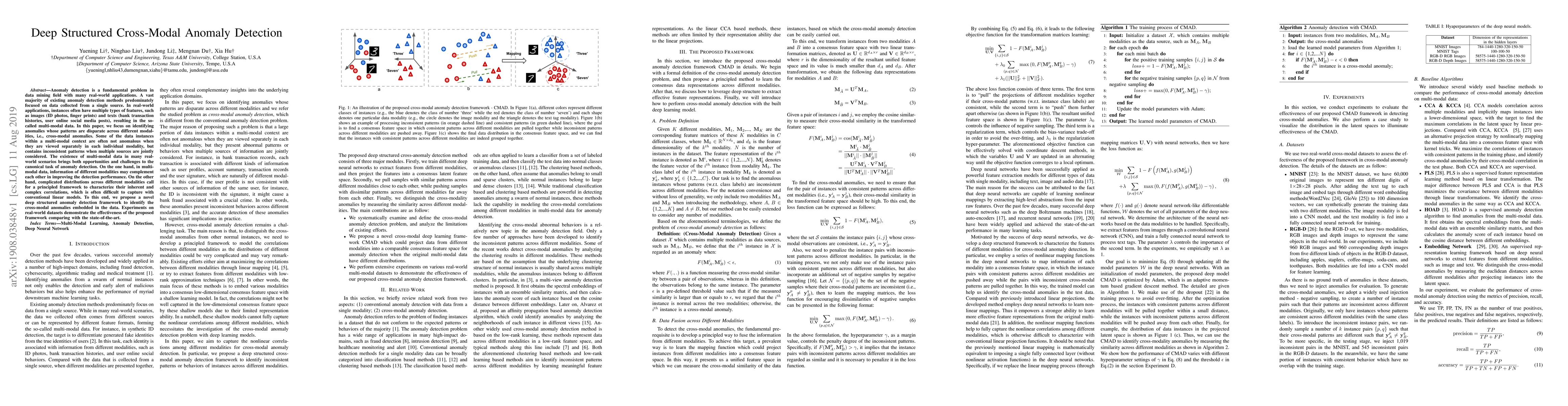 Anomaly detection is a fundamental problem in data mining field with many real-world applications. A vast majority of existing anomaly detection methods predominately focused on data collected from a single source. In real-world applications, instances often have multiple types of features, such as images (ID photos, finger prints) and texts (bank transaction histories, user online social media posts), resulting in the so-called multi-modal data. In this paper, we focus on identifying anomalies whose patterns are disparate across different modalities, i.e., cross-modal anomalies. Some of the data instances within a multi-modal context are often not anomalous when they are viewed separately in each individual modality, but contains inconsistent patterns when multiple sources are jointly considered. The existence of multi-modal data in many real-world scenarios brings both opportunities and challenges to the canonical task of anomaly detection. On the one hand, in multi-modal data, information of different modalities may complement each other in improving the detection performance. On the other hand, complicated distributions across different modalities call for a principled framework to characterize their inherent and complex correlations, which is often difficult to capture with conventional linear models. To this end, we propose a novel deep structured anomaly detection framework to identify the cross-modal anomalies embedded in the data. Experiments on real-world datasets demonstrate the effectiveness of the proposed framework comparing with the state-of-the-art.