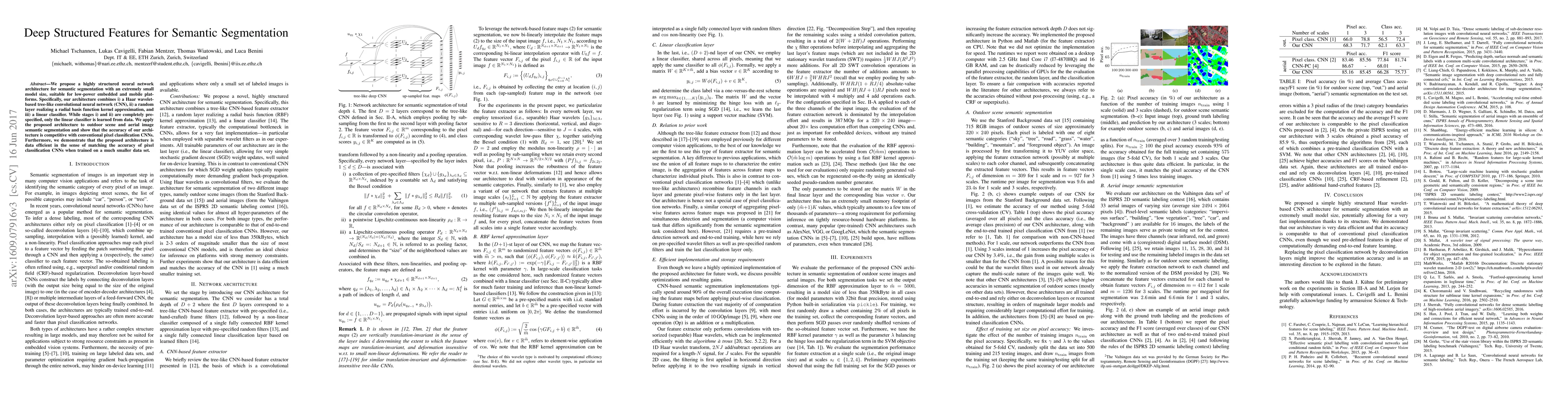 We propose a highly structured neural network architecture for semantic segmentation with an extremely small model size, suitable for low-power embedded and mobile platforms. Specifically, our architecture combines i) a Haar wavelet-based tree-like convolutional neural network (CNN), ii) a random layer realizing a radial basis function kernel approximation, and iii) a linear classifier. While stages i) and ii) are completely pre-specified, only the linear classifier is learned from data. We apply the proposed architecture to outdoor scene and aerial image semantic segmentation and show that the accuracy of our architecture is competitive with conventional pixel classification CNNs. Furthermore, we demonstrate that the proposed architecture is data efficient in the sense of matching the accuracy of pixel classification CNNs when trained on a much smaller data set.