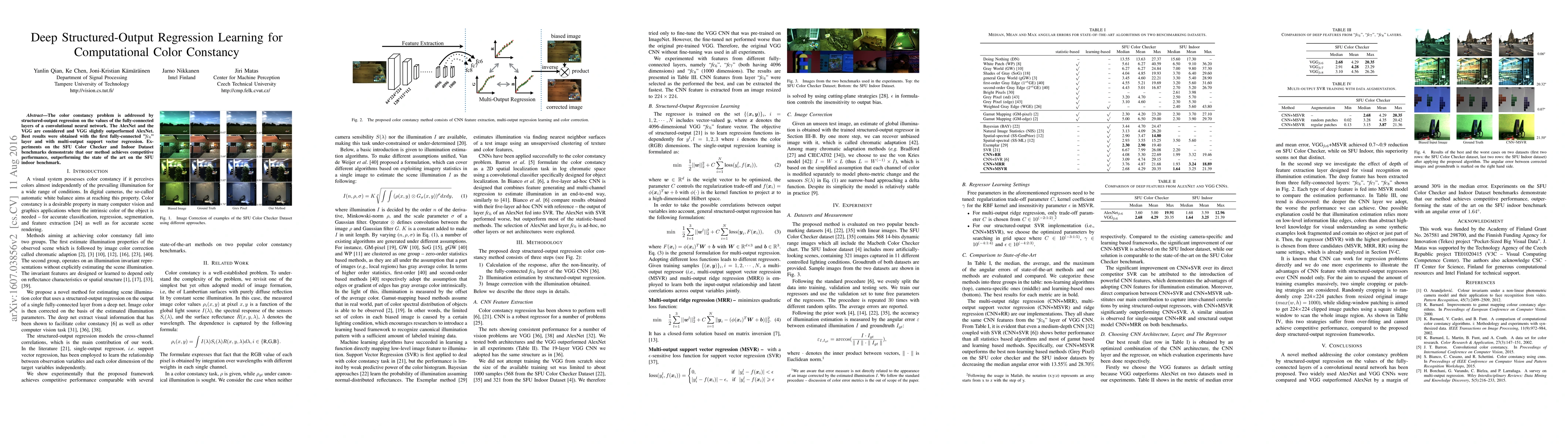 This paper proposes a deep structured-output regression learning framework for computational color constancy, leveraging deep convolutional neural networks to automatically extract robust features and model complex interdependencies among different dimensions of target variables. The method achieves competitive performance on public benchmarks compared to state-of-the-art approaches.