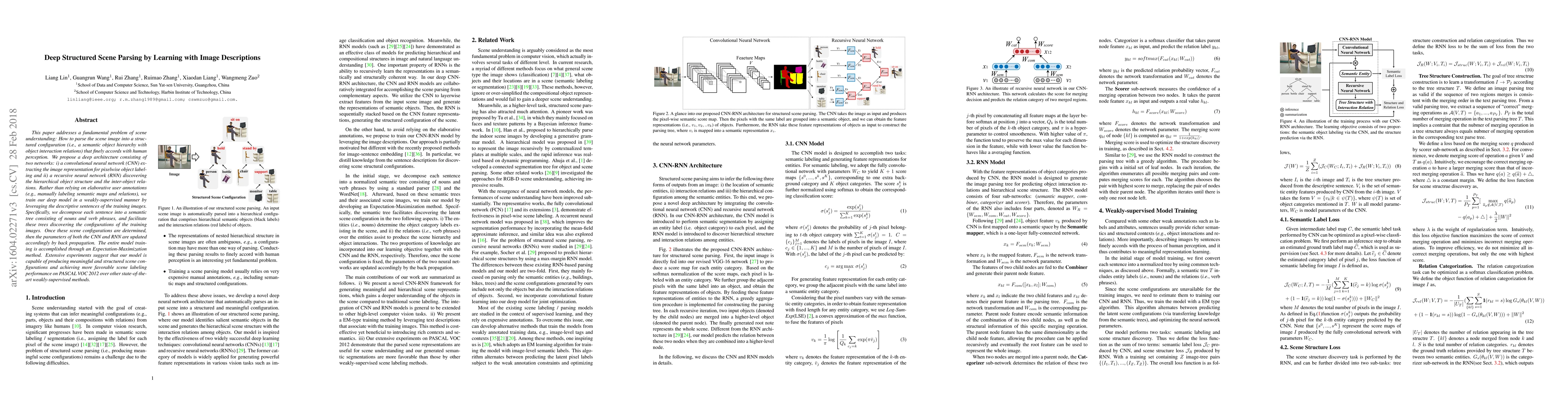 This paper presents a deep learning model for parsing scene images into structured configurations by using image descriptions instead of elaborate annotations. The model combines CNNs for pixelwise labeling and RNNs for hierarchical structure discovery, trained via an Expectation-Maximization method, achieving better scene labeling than state-of-the-art methods.