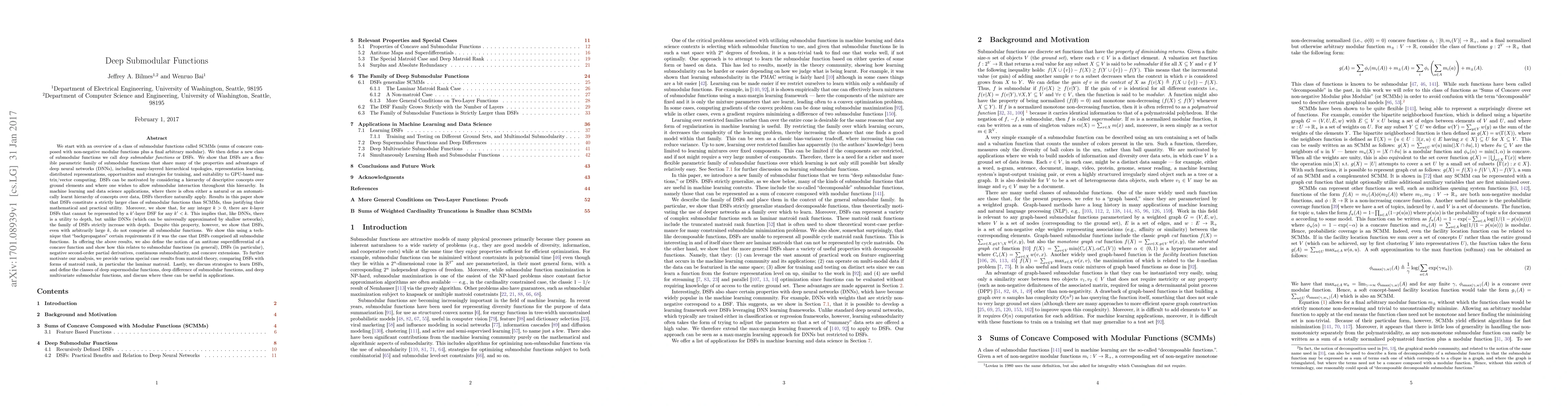 This paper introduces deep submodular functions (DSFs), a new class of submodular functions that exhibit properties similar to deep neural networks, including a utility to depth. It demonstrates that DSFs form a strictly larger class than sums of concave composed with non-negative modular functions, and discusses learning strategies and applications for these functions.