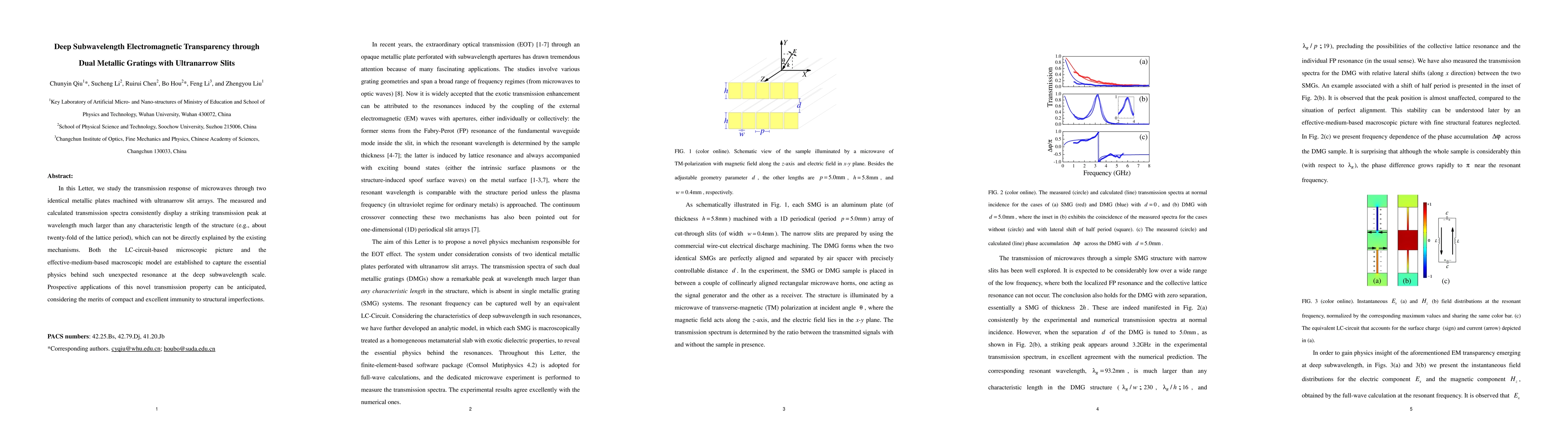 This paper investigates the deep subwavelength electromagnetic transparency achieved by dual metallic gratings with ultranarrow slits, revealing an unexpected transmission peak at wavelengths much larger than the slit dimensions. Both microscopic and macroscopic models are used to explain this phenomenon, suggesting potential applications due to compact design and robustness.