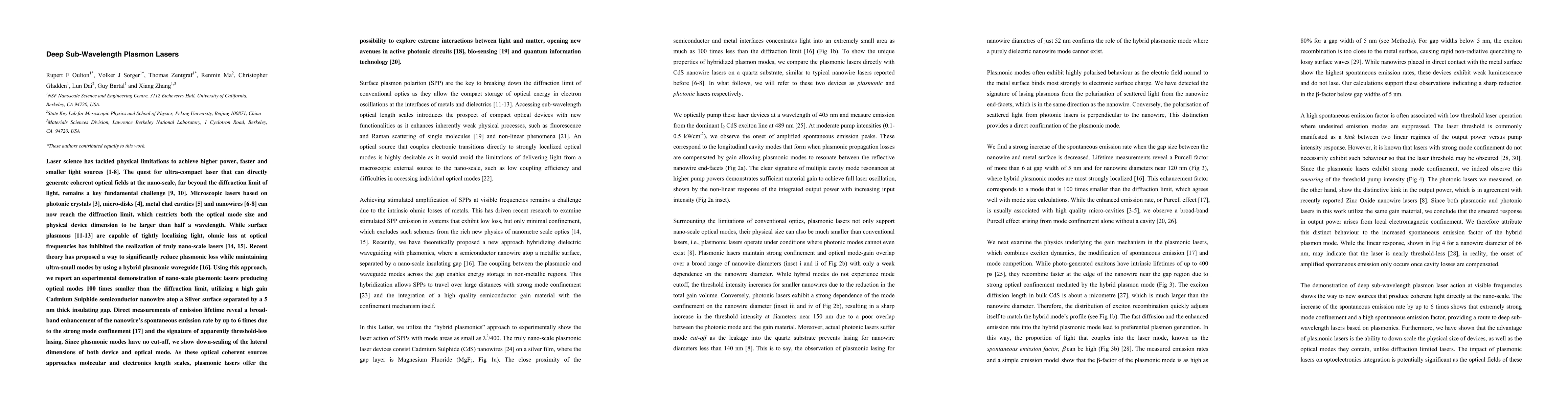 This paper reports on the experimental realization of deep subwavelength plasmonic lasers using a hybrid plasmonic waveguide, achieving optical modes 100 times smaller than the diffraction limit. The study demonstrates threshold-less lasing in a Cadmium Sulphide semiconductor nanowire atop a Silver surface, showing potential for applications in active photonic circuits, bio-sensing, and quantum information technology.