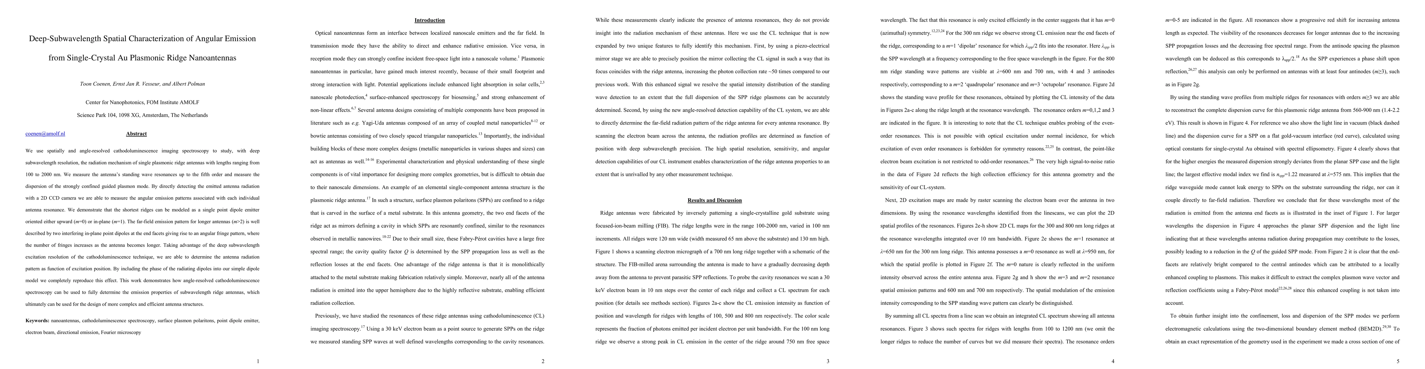 This paper investigates the angular emission patterns of single-crystal Au plasmonic ridge nanoantennas using deep-subwavelength cathodoluminescence imaging. The study reveals that shorter ridges act as single point dipoles, while longer ridges exhibit an angular fringe pattern due to two interfering in-plane dipoles, providing insights into the design of advanced antenna structures.