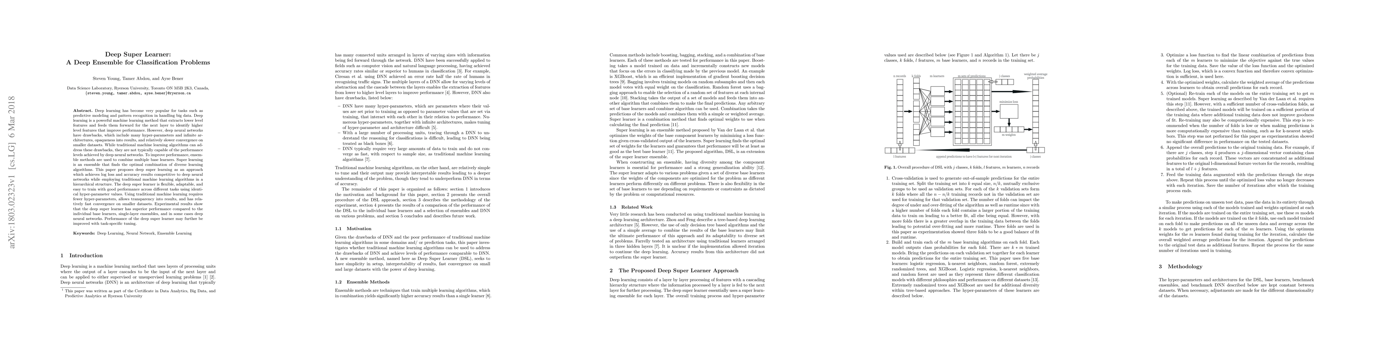 This paper introduces Deep Super Learner, an ensemble method combining traditional machine learning algorithms to achieve performance competitive with deep neural networks, while offering benefits like fewer hyper-parameters, faster convergence, and better interpretability. Experimental results demonstrate superior performance over individual base learners and single-layer ensembles.