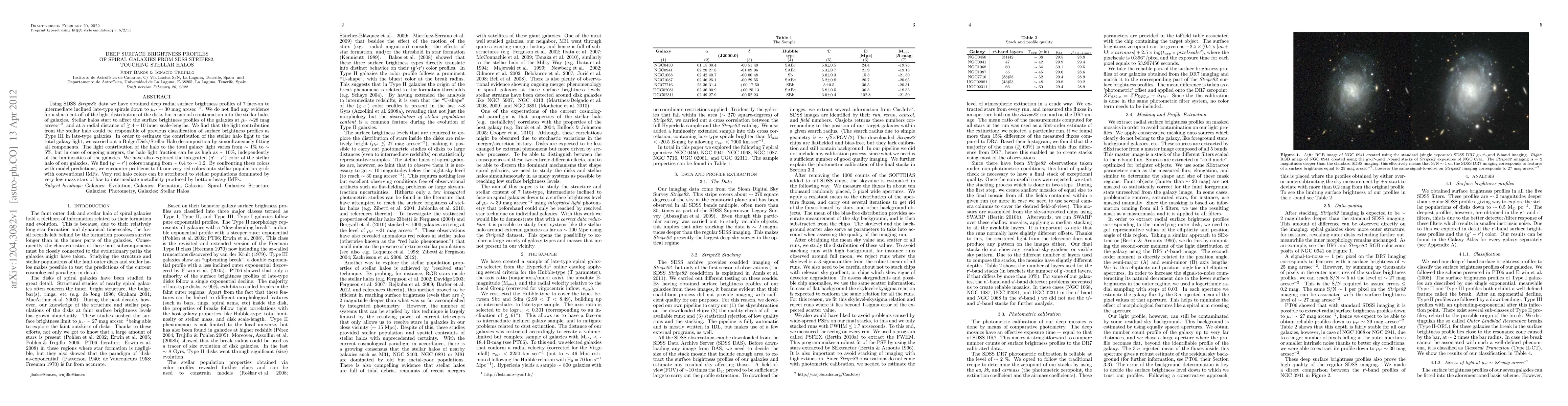 This study uses SDSS Stripe82 data to analyze deep surface brightness profiles of 7 late-type spiral galaxies, finding no sharp cutoff but a smooth transition into stellar halos. The halo light contributes 1-5% to total galaxy light, with up to 10% in merging galaxies, and exhibits very red colors, suggesting populations of low-mass, low-to-intermediate metallicity stars from bottom-heavy IMFs.