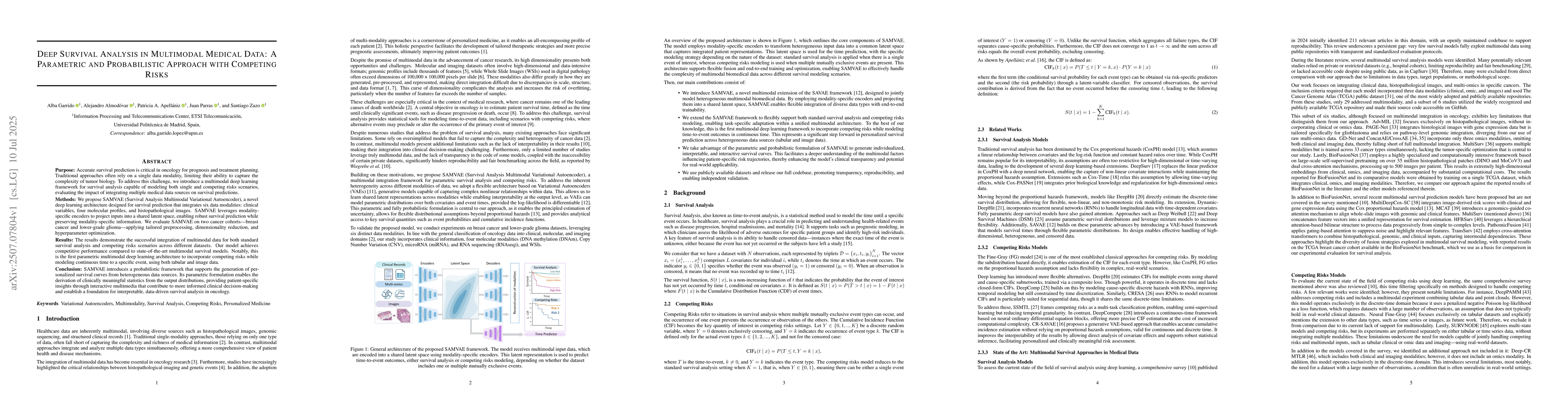 Accurate survival prediction is critical in oncology for prognosis and treatment planning. Traditional approaches often rely on a single data modality, limiting their ability to capture the complexity of tumor biology. To address this challenge, we introduce a multimodal deep learning framework for survival analysis capable of modeling both single and competing risks scenarios, evaluating the impact of integrating multiple medical data sources on survival predictions. We propose SAMVAE (Survival Analysis Multimodal Variational Autoencoder), a novel deep learning architecture designed for survival prediction that integrates six data modalities: clinical variables, four molecular profiles, and histopathological images. SAMVAE leverages modality specific encoders to project inputs into a shared latent space, enabling robust survival prediction while preserving modality specific information. Its parametric formulation enables the derivation of clinically meaningful statistics from the output distributions, providing patient-specific insights through interactive multimedia that contribute to more informed clinical decision-making and establish a foundation for interpretable, data-driven survival analysis in oncology. We evaluate SAMVAE on two cancer cohorts breast cancer and lower grade glioma applying tailored preprocessing, dimensionality reduction, and hyperparameter optimization. The results demonstrate the successful integration of multimodal data for both standard survival analysis and competing risks scenarios across different datasets. Our model achieves competitive performance compared to state-of-the-art multimodal survival models. Notably, this is the first parametric multimodal deep learning architecture to incorporate competing risks while modeling continuous time to a specific event, using both tabular and image data.