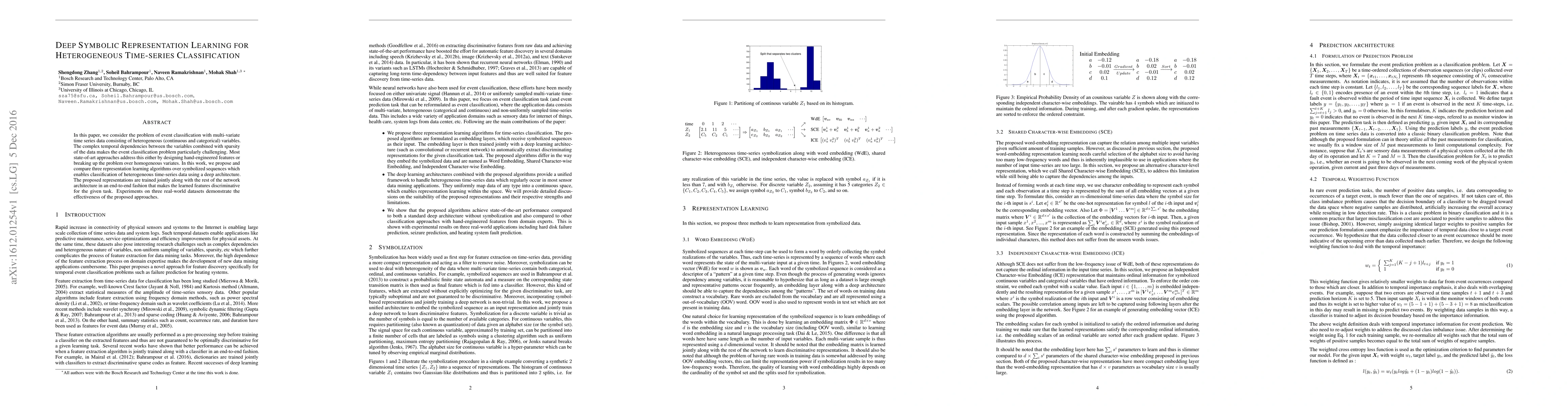 This paper proposes three deep symbolic representation learning algorithms for classifying heterogeneous time-series data, which includes both continuous and categorical variables. The methods are trained jointly in an end-to-end fashion to produce discriminative features, and experiments on real-world datasets show their effectiveness.