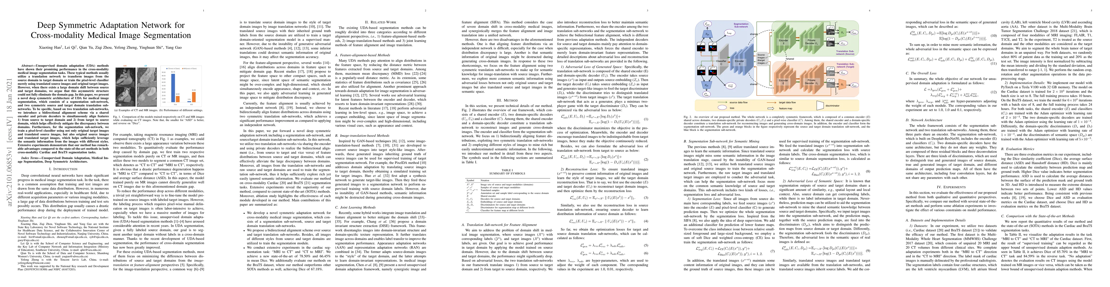 This paper introduces a deep symmetric adaptation network for cross-modality medical image segmentation, featuring a bidirectional alignment scheme to mitigate domain discrepancies. The method leverages both source and target domain images for training, demonstrating superior performance in Cardiac and BraTS segmentation tasks.