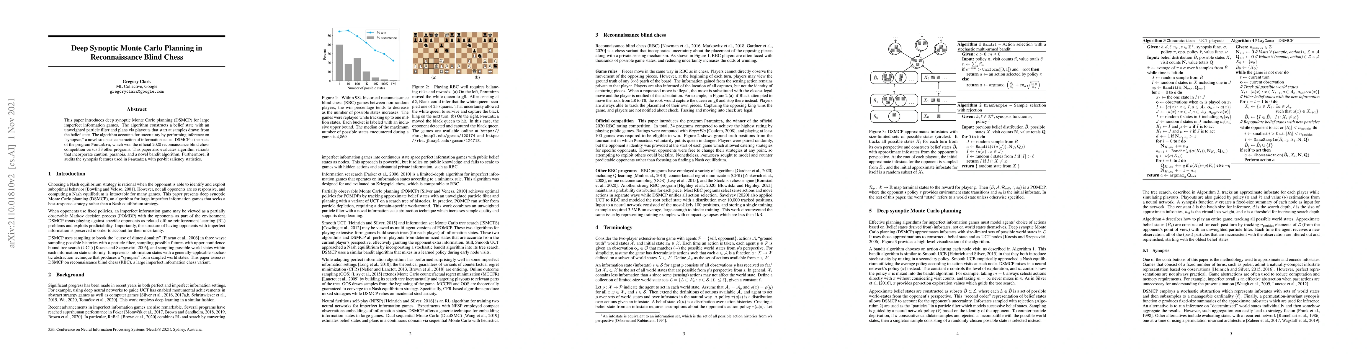 This paper introduces deep synoptic Monte Carlo planning (DSMCP) for large imperfect information games. The algorithm constructs a belief state with an unweighted particle filter and plans via playouts that start at samples drawn from the belief state. The algorithm accounts for uncertainty by performing inference on "synopses," a novel stochastic abstraction of information states. DSMCP is the basis of the program Penumbra, which won the official 2020 reconnaissance blind chess competition versus 33 other programs. This paper also evaluates algorithm variants that incorporate caution, paranoia, and a novel bandit algorithm. Furthermore, it audits the synopsis features used in Penumbra with per-bit saliency statistics.