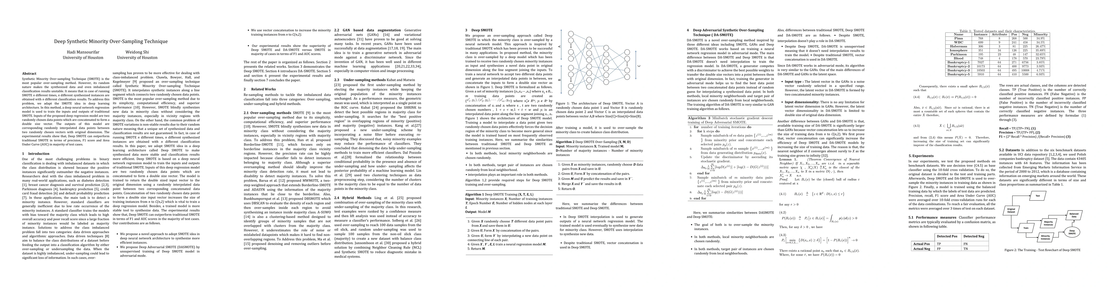 Synthetic Minority Over-sampling Technique (SMOTE) is the most popular over-sampling method. However, its random nature makes the synthesized data and even imbalanced classification results unstable. It means that in case of running SMOTE n different times, n different synthesized in-stances are obtained with n different classification results. To address this problem, we adapt the SMOTE idea in deep learning architecture. In this method, a deep neural network regression model is used to train the inputs and outputs of traditional SMOTE. Inputs of the proposed deep regression model are two randomly chosen data points which are concatenated to form a double size vector. The outputs of this model are corresponding randomly interpolated data points between two randomly chosen vectors with original dimension. The experimental results show that, Deep SMOTE can outperform traditional SMOTE in terms of precision, F1 score and Area Under Curve (AUC) in majority of test cases.