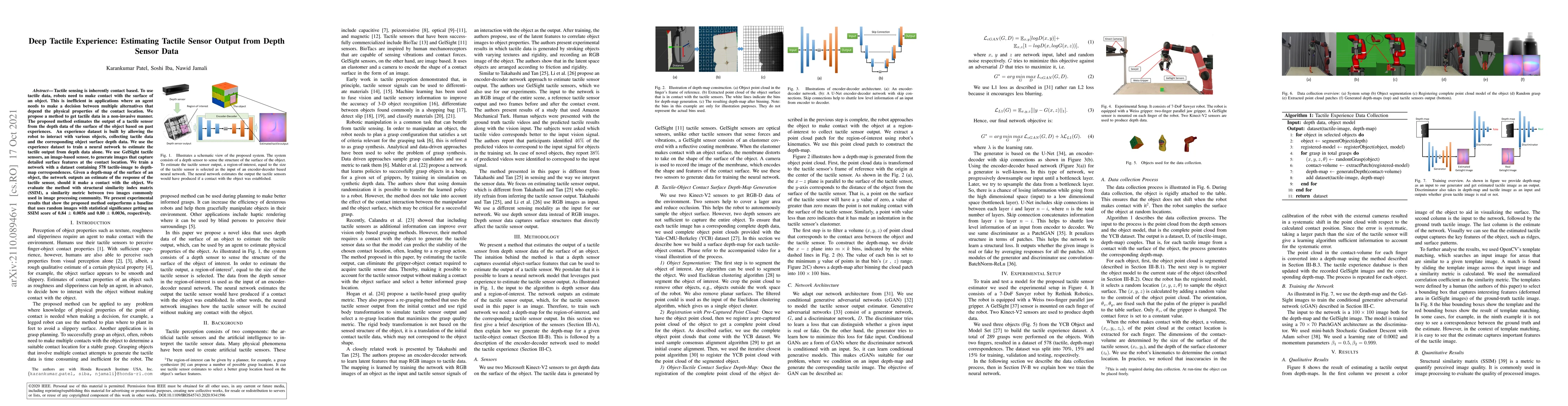 This paper proposes a method to estimate tactile sensor output from depth data without direct contact, using a neural network trained on an experience dataset of tactile-image to depthmap correspondences. The method outperforms a baseline, achieving a structural similarity index matrix (SSIM) score of 0.84 +/- 0.0056.