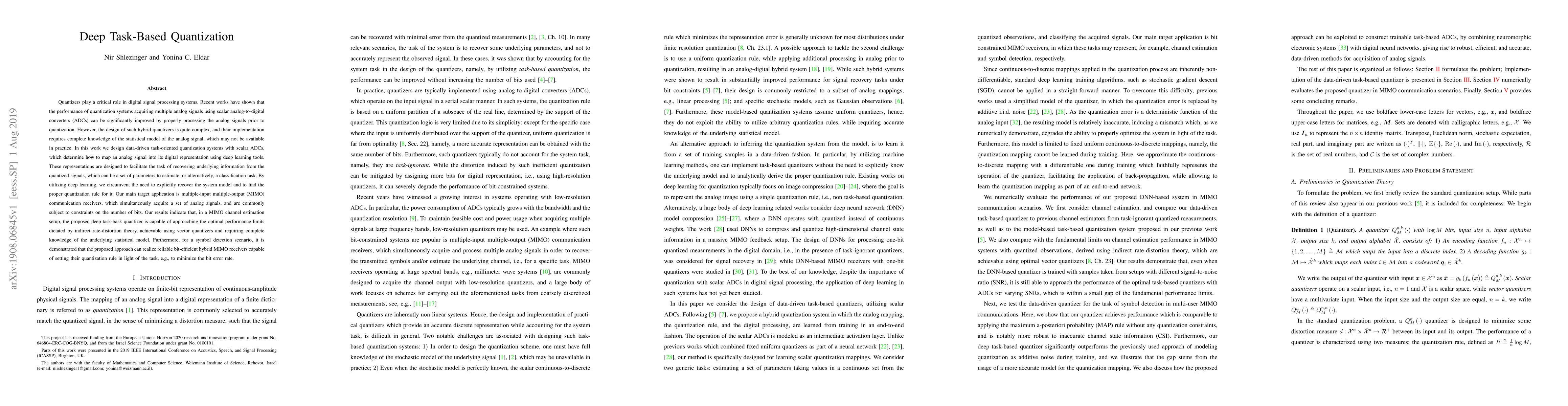 This paper proposes a data-driven, task-oriented quantization system using deep learning for scalar ADCs, aiming to improve the performance of MIMO communication receivers. The approach enables efficient quantization without requiring complete knowledge of the signal model, achieving near-optimal performance in MIMO channel estimation and reliable bit-efficient symbol detection.