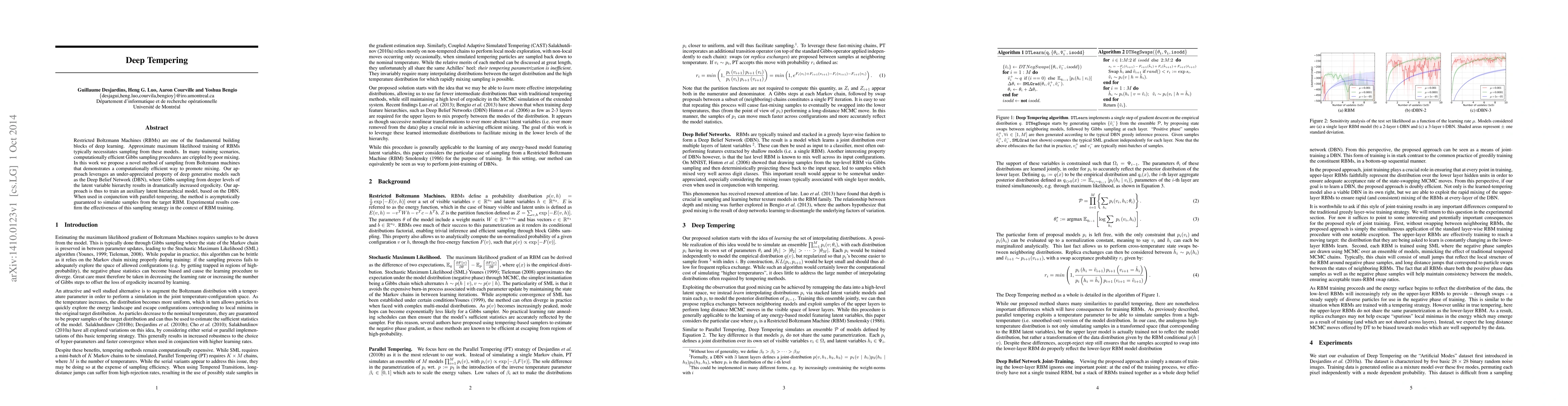 Restricted Boltzmann Machines (RBMs) are one of the fundamental building blocks of deep learning. Approximate maximum likelihood training of RBMs typically necessitates sampling from these models. In many training scenarios, computationally efficient Gibbs sampling procedures are crippled by poor mixing. In this work we propose a novel method of sampling from Boltzmann machines that demonstrates a computationally efficient way to promote mixing. Our approach leverages an under-appreciated property of deep generative models such as the Deep Belief Network (DBN), where Gibbs sampling from deeper levels of the latent variable hierarchy results in dramatically increased ergodicity. Our approach is thus to train an auxiliary latent hierarchical model, based on the DBN. When used in conjunction with parallel-tempering, the method is asymptotically guaranteed to simulate samples from the target RBM. Experimental results confirm the effectiveness of this sampling strategy in the context of RBM training.