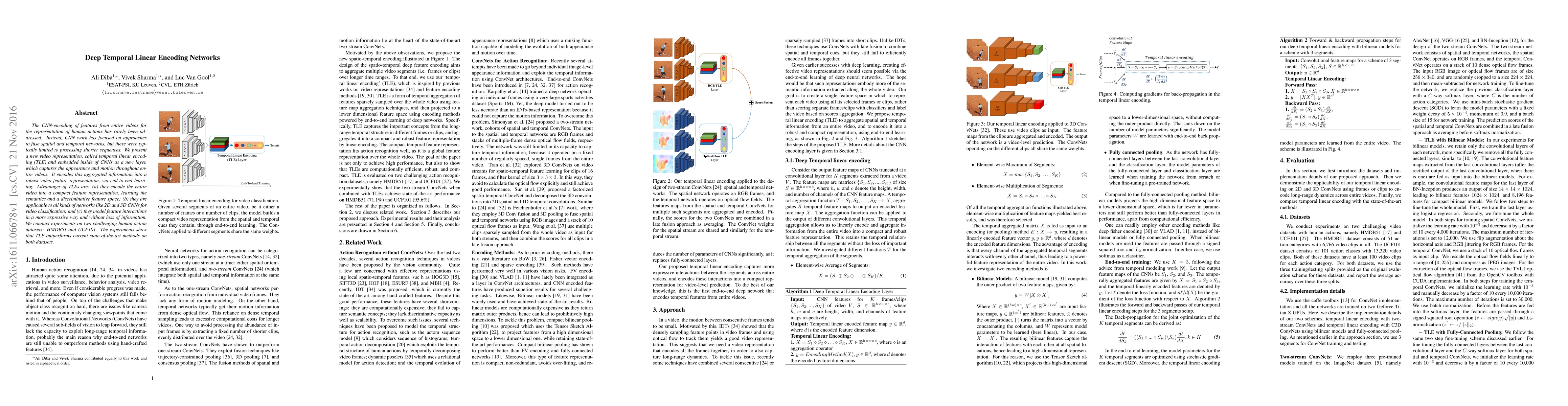 A new video representation called temporal linear encoding (TLE) is presented, which captures entire videos into a compact feature representation via end-to-end learning, outperforming current state-of-the-art methods on two challenging human action datasets.