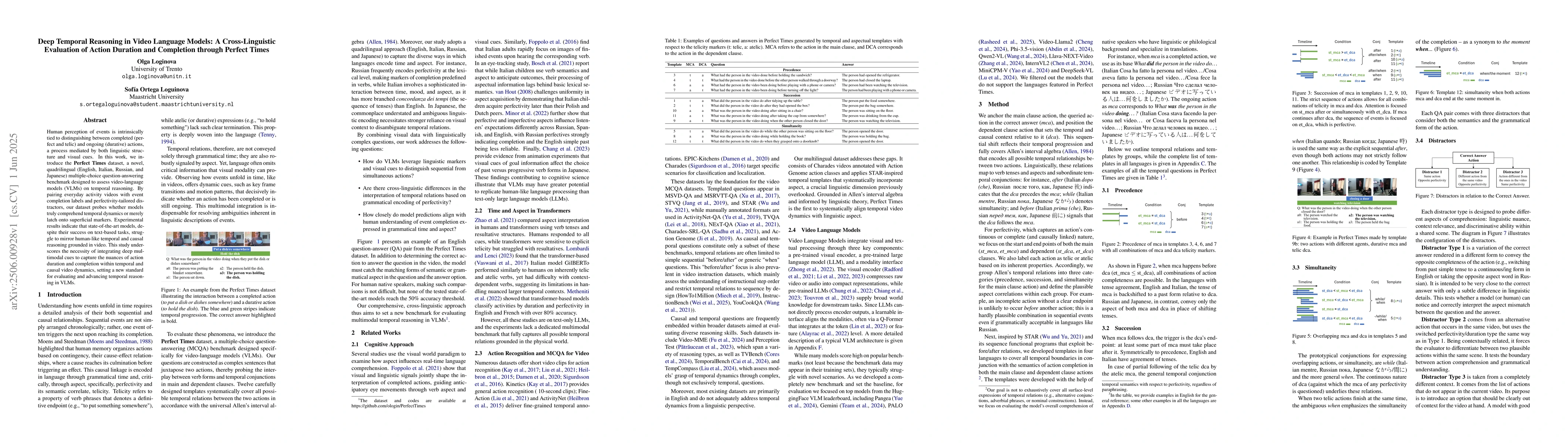 The research introduces the Perfect Times dataset, a quadrilingual multiple-choice question-answering benchmark for assessing video-language models (VLMs) on temporal reasoning. It pairs everyday activity videos with event completion labels and perfectivity-tailored distractors.