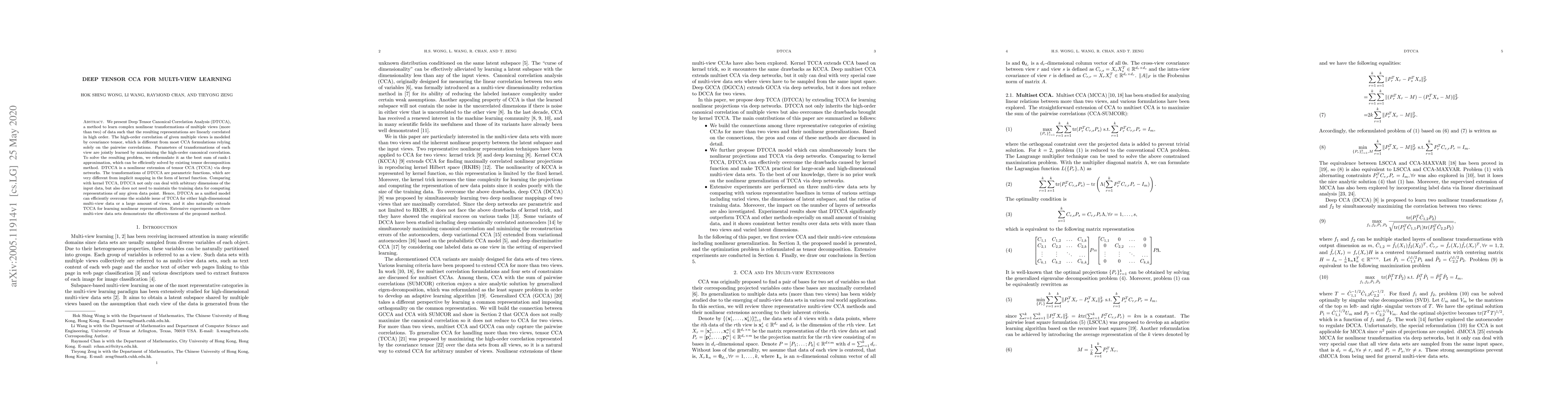 Deep Tensor Canonical Correlation Analysis (DTCCA) extends tensor CCA (TCCA) using deep networks to learn nonlinear transformations of multiple data views, maximizing high-order correlations modeled by covariance tensors. Unlike kernel TCCA, DTCCA handles high-dimensional data efficiently without needing training data for representation computation.
