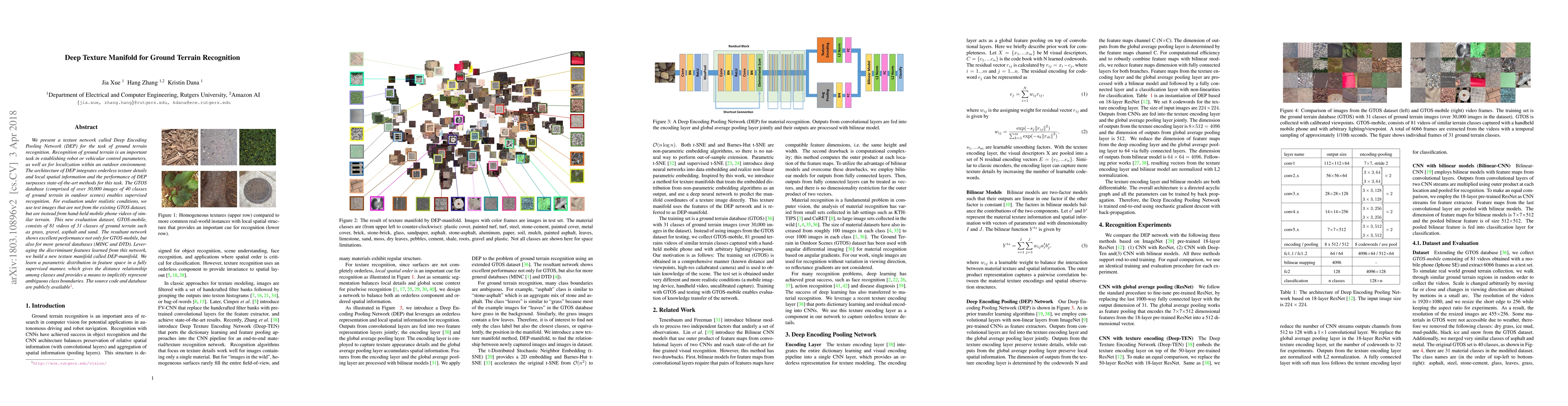 We present a texture network called Deep Encoding Pooling Network (DEP) for the task of ground terrain recognition. Recognition of ground terrain is an important task in establishing robot or vehicular control parameters, as well as for localization within an outdoor environment. The architecture of DEP integrates orderless texture details and local spatial information and the performance of DEP surpasses state-of-the-art methods for this task. The GTOS database (comprised of over 30,000 images of 40 classes of ground terrain in outdoor scenes) enables supervised recognition. For evaluation under realistic conditions, we use test images that are not from the existing GTOS dataset, but are instead from hand-held mobile phone videos of similar terrain. This new evaluation dataset, GTOS-mobile, consists of 81 videos of 31 classes of ground terrain such as grass, gravel, asphalt and sand. The resultant network shows excellent performance not only for GTOS-mobile, but also for more general databases (MINC and DTD). Leveraging the discriminant features learned from this network, we build a new texture manifold called DEP-manifold. We learn a parametric distribution in feature space in a fully supervised manner, which gives the distance relationship among classes and provides a means to implicitly represent ambiguous class boundaries. The source code and database are publicly available.