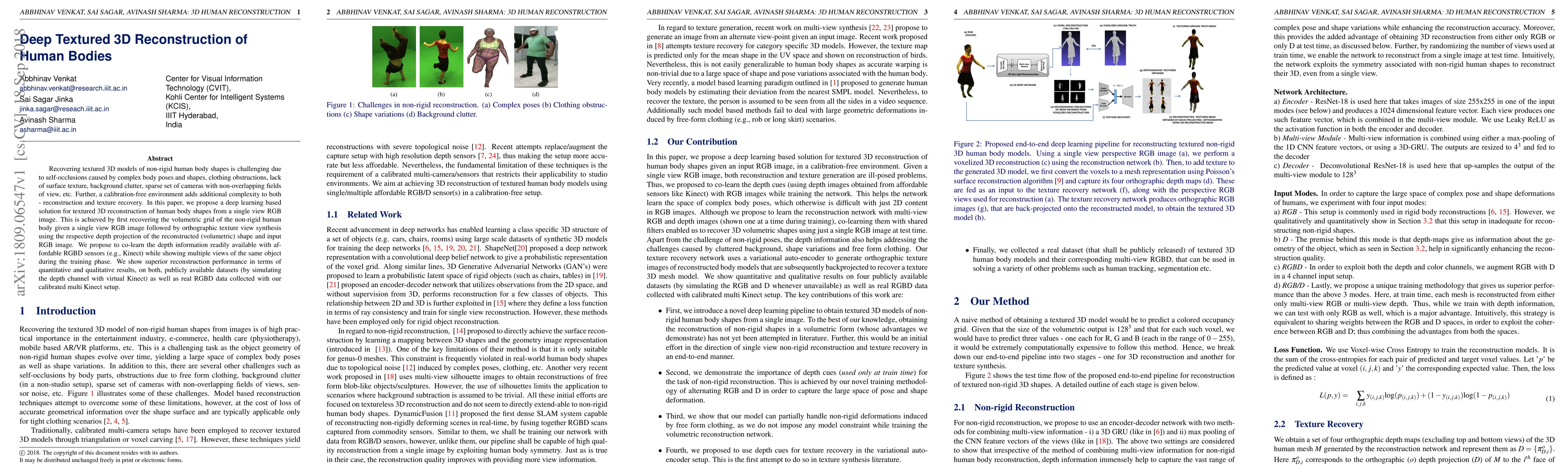 This paper presents a deep learning approach for reconstructing textured 3D models of human bodies from a single RGB image, overcoming challenges like self-occlusion and lack of texture. It uses a volumetric grid recovery and orthographic texture synthesis, leveraging depth information from RGBD sensors during training.