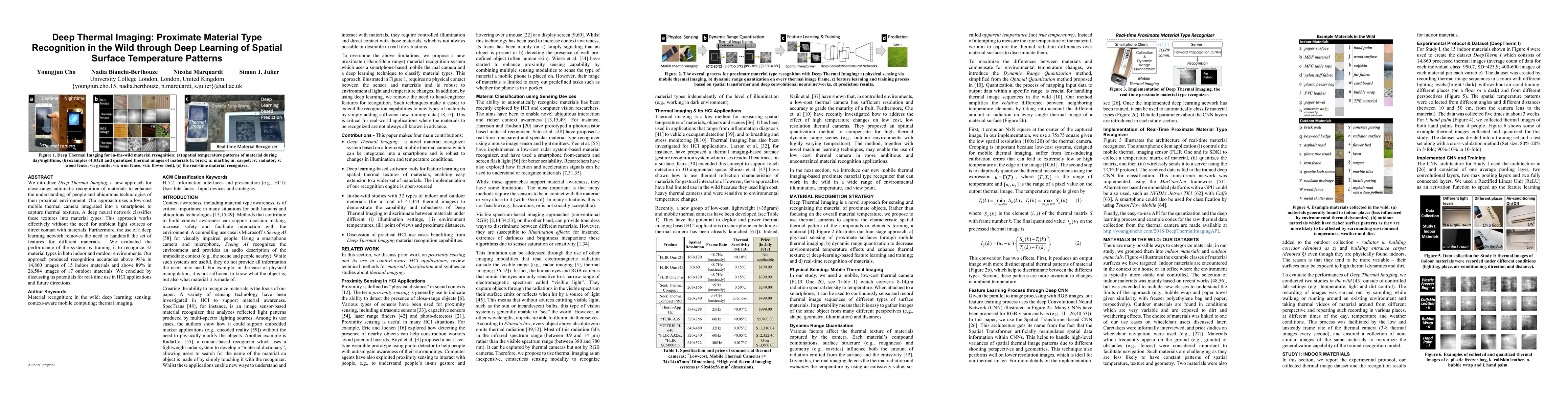 This research introduces Deep Thermal Imaging, a method using a smartphone's thermal camera and deep learning to identify 32 material types indoors and 17 outdoors with over 98% and 89% accuracy respectively, respectively eliminating the need for ambient light or physical contact.