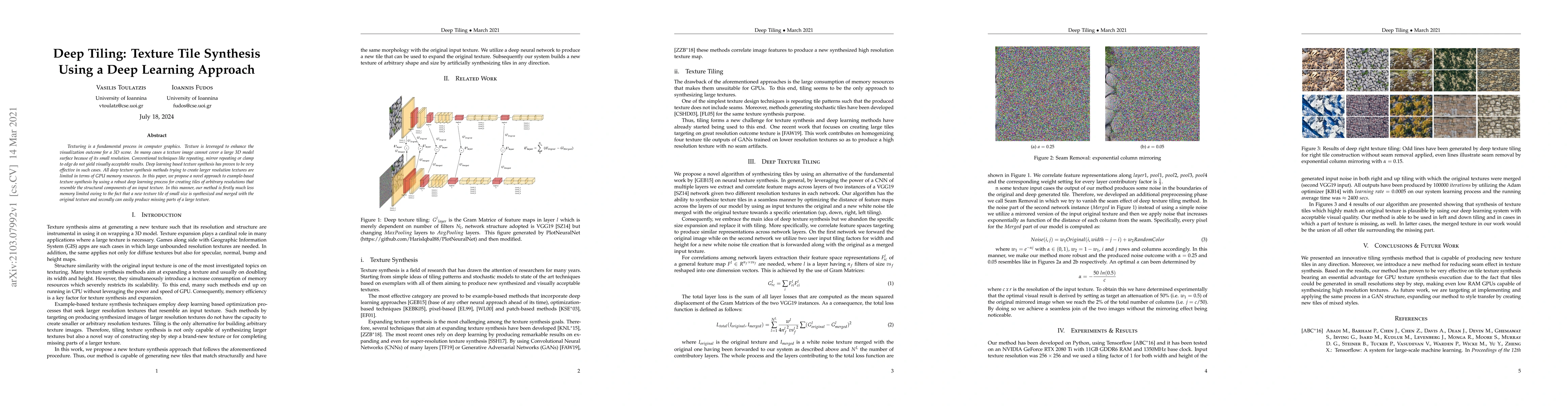 Texturing is a fundamental process in computer graphics. Texture is leveraged to enhance the visualization outcome for a 3D scene. In many cases a texture image cannot cover a large 3D model surface because of its small resolution. Conventional techniques like repeating, mirror repeating or clamp to edge do not yield visually acceptable results. Deep learning based texture synthesis has proven to be very effective in such cases. All deep texture synthesis methods trying to create larger resolution textures are limited in terms of GPU memory resources. In this paper, we propose a novel approach to example-based texture synthesis by using a robust deep learning process for creating tiles of arbitrary resolutions that resemble the structural components of an input texture. In this manner, our method is firstly much less memory limited owing to the fact that a new texture tile of small size is synthesized and merged with the original texture and secondly can easily produce missing parts of a large texture.