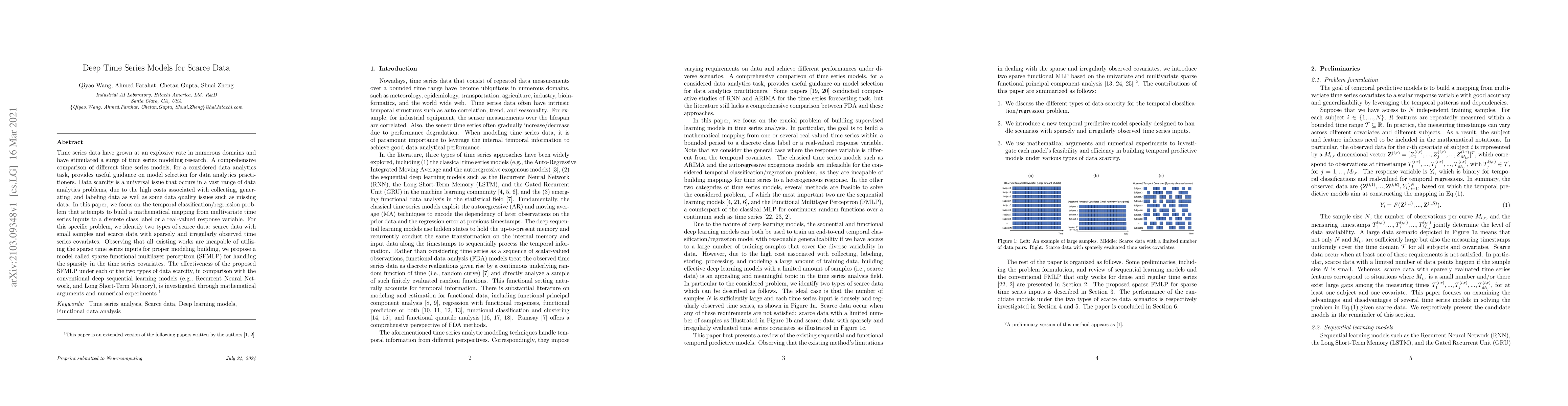 Time series data have grown at an explosive rate in numerous domains and have stimulated a surge of time series modeling research. A comprehensive comparison of different time series models, for a considered data analytics task, provides useful guidance on model selection for data analytics practitioners. Data scarcity is a universal issue that occurs in a vast range of data analytics problems, due to the high costs associated with collecting, generating, and labeling data as well as some data quality issues such as missing data. In this paper, we focus on the temporal classification/regression problem that attempts to build a mathematical mapping from multivariate time series inputs to a discrete class label or a real-valued response variable. For this specific problem, we identify two types of scarce data: scarce data with small samples and scarce data with sparsely and irregularly observed time series covariates. Observing that all existing works are incapable of utilizing the sparse time series inputs for proper modeling building, we propose a model called sparse functional multilayer perceptron (SFMLP) for handling the sparsity in the time series covariates. The effectiveness of the proposed SFMLP under each of the two types of data scarcity, in comparison with the conventional deep sequential learning models (e.g., Recurrent Neural Network, and Long Short-Term Memory), is investigated through mathematical arguments and numerical experiments.