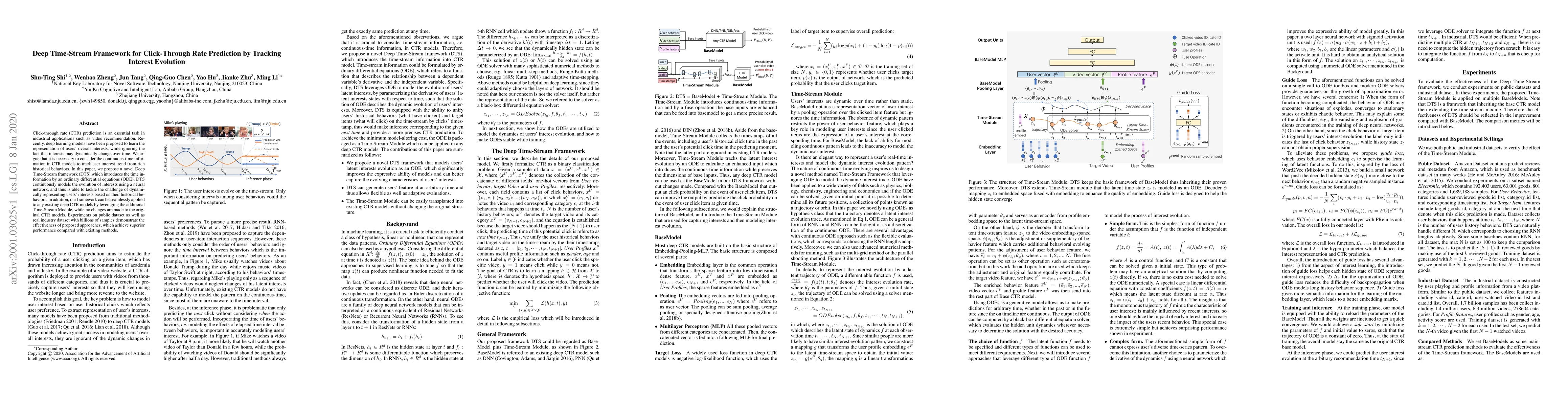 Click-through rate (CTR) prediction is an essential task in industrial applications such as video recommendation. Recently, deep learning models have been proposed to learn the representation of users' overall interests, while ignoring the fact that interests may dynamically change over time. We argue that it is necessary to consider the continuous-time information in CTR models to track user interest trend from rich historical behaviors. In this paper, we propose a novel Deep Time-Stream framework (DTS) which introduces the time information by an ordinary differential equations (ODE). DTS continuously models the evolution of interests using a neural network, and thus is able to tackle the challenge of dynamically representing users' interests based on their historical behaviors. In addition, our framework can be seamlessly applied to any existing deep CTR models by leveraging the additional Time-Stream Module, while no changes are made to the original CTR models. Experiments on public dataset as well as real industry dataset with billions of samples demonstrate the effectiveness of proposed approaches, which achieve superior performance compared with existing methods.