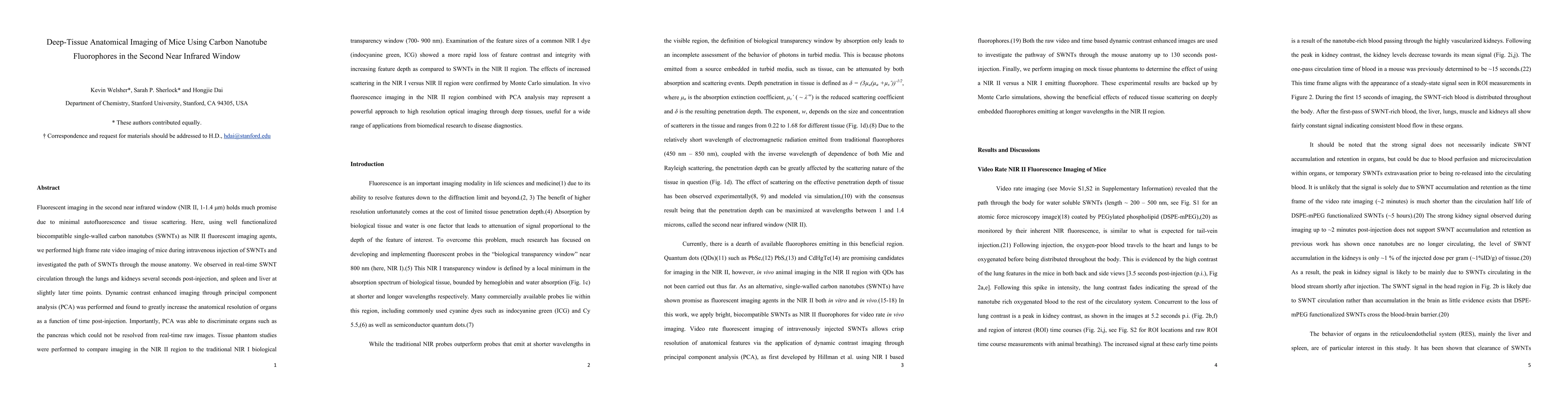 This paper demonstrates the use of biocompatible single-walled carbon nanotubes (SWNTs) as fluorescent imaging agents in the NIR II window for deep-tissue anatomical imaging of mice. The study shows high-resolution real-time imaging of SWNTs' circulation through mouse organs, enhanced by principal component analysis (PCA) to improve anatomical resolution and discriminate organs like the pancreas.