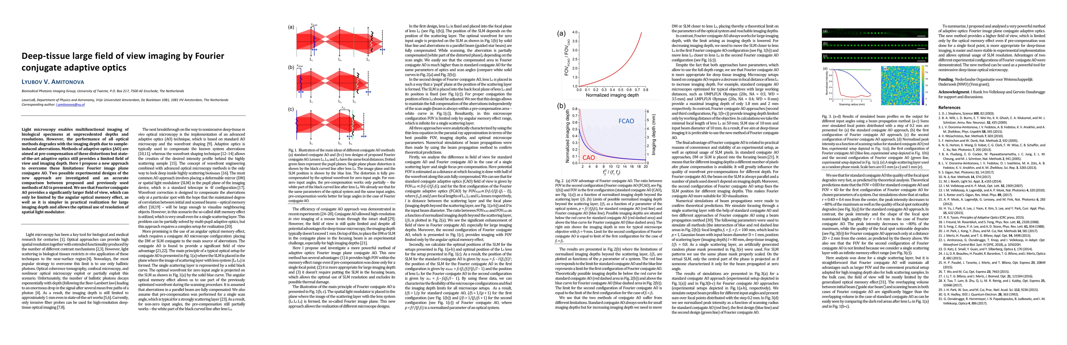 This paper proposes a novel Fourier conjugate adaptive optics method for deep-tissue imaging, significantly enhancing the field of view and depth compared to existing adaptive optics techniques. The new approach leverages the Fourier plane for better aberration correction and is simpler to implement, optimizing the use of spatial light modulators.