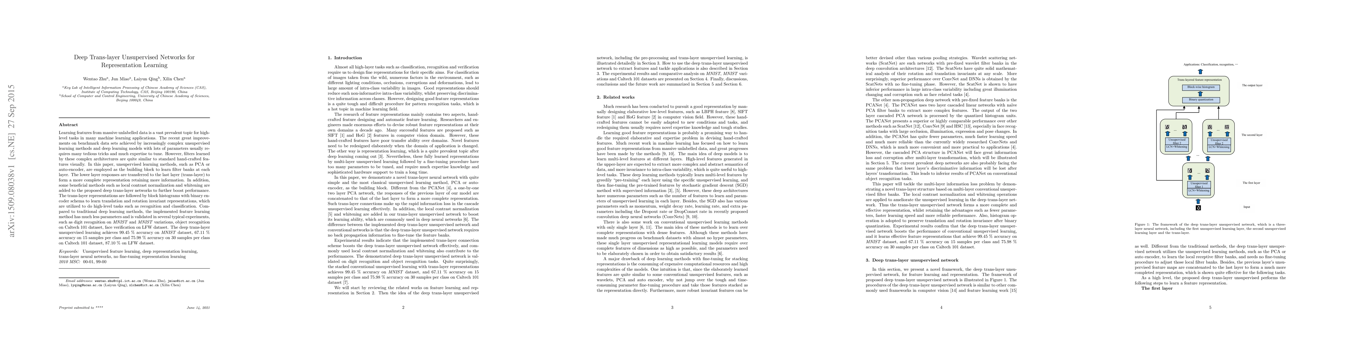 This paper proposes deep trans-layer unsupervised networks for efficient representation learning from unlabeled data, utilizing methods like PCA and auto-encoders to form filter banks across layers. The method achieves high accuracy on tasks like digit recognition, object recognition, and face verification with fewer parameters compared to traditional deep learning methods.