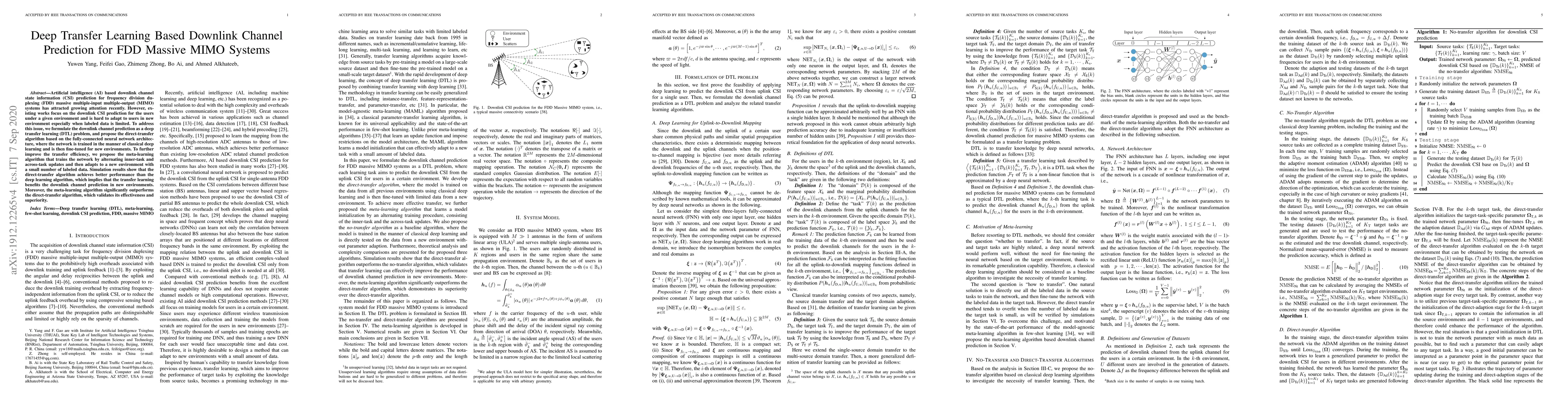 This paper proposes a deep transfer learning approach for downlink channel state information prediction in FDD massive MIMO systems, addressing the challenge of adapting to new environments with limited labeled data. The direct-transfer algorithm and meta-learning algorithm both improve prediction accuracy and stability compared to traditional deep learning methods.