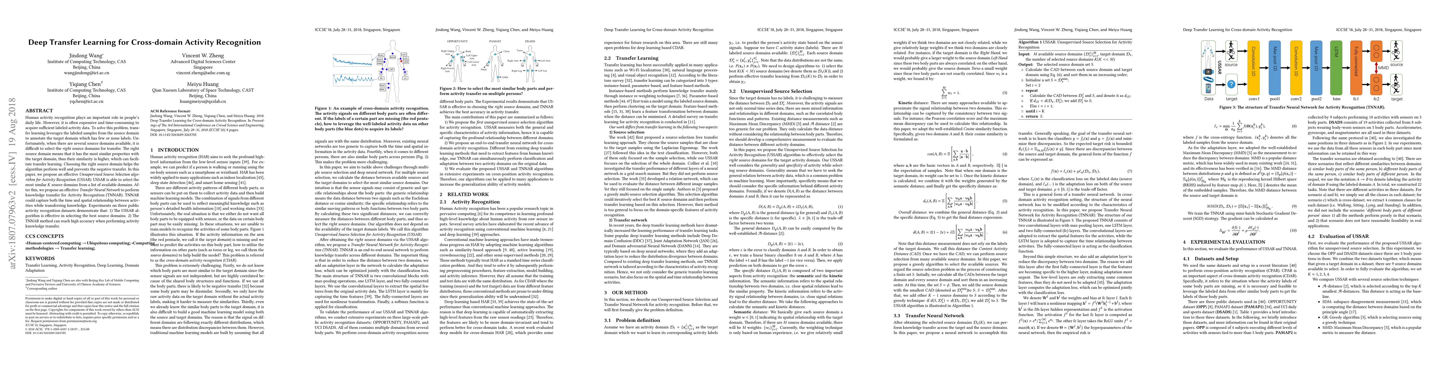 This paper proposes an Unsupervised Source Selection algorithm (USSAR) to identify the most similar source domains for transfer learning in activity recognition, and a Transfer Neural Network (TNNAR) for effective knowledge transfer. Experiments show that USSAR selects optimal source domains, and TNNAR achieves high accuracy in cross-domain activity recognition.