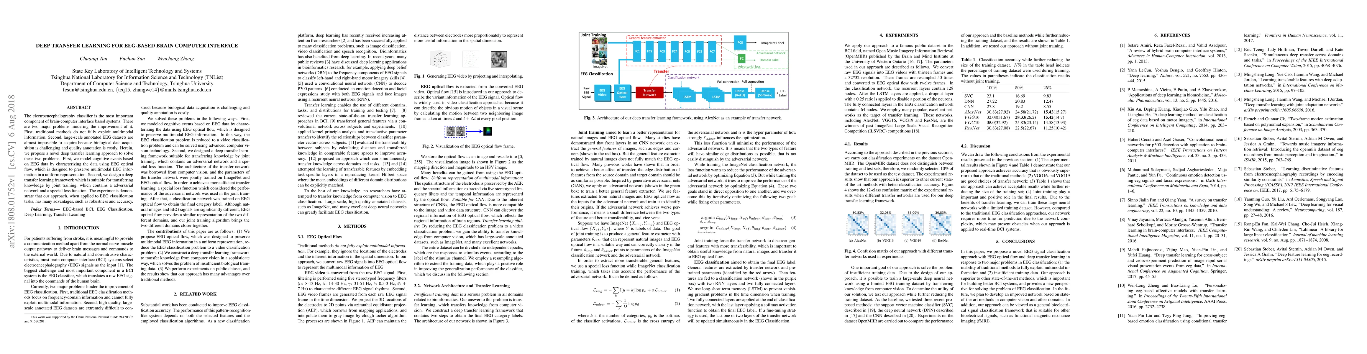 This paper proposes a deep transfer learning approach for EEG-based brain-computer interface systems, addressing the challenges of multimodal information exploitation and data scarcity. The method uses EEG optical flow to represent multimodal EEG data and a deep transfer learning framework with adversarial training for robust and accurate classification.