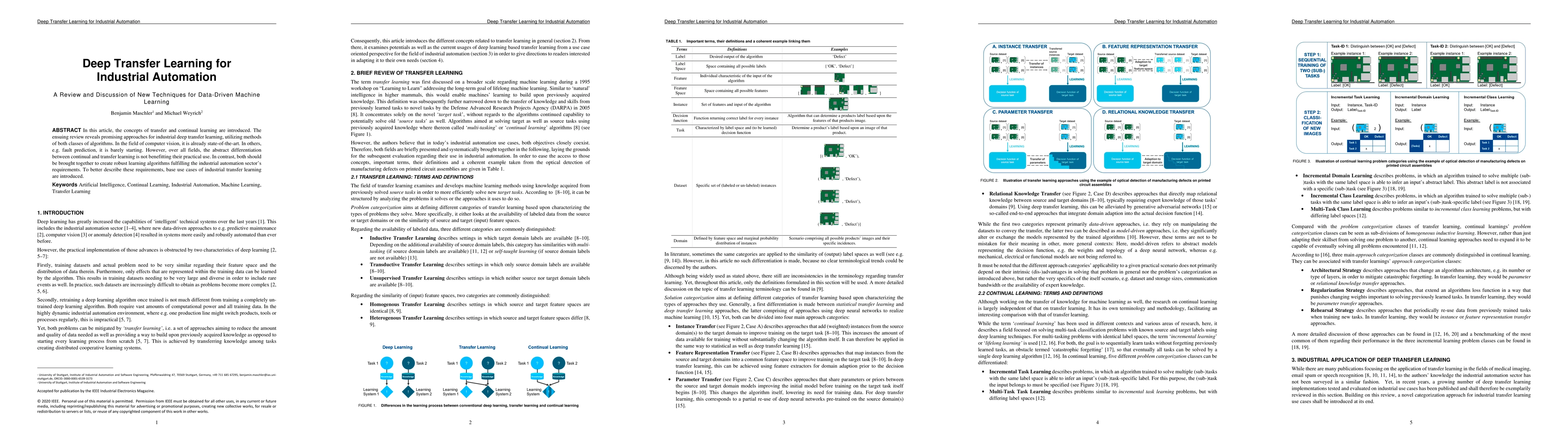 In this article, the concepts of transfer and continual learning are introduced. The ensuing review reveals promising approaches for industrial deep transfer learning, utilizing methods of both classes of algorithms. In the field of computer vision, it is already state-of-the-art. In others, e.g. fault prediction, it is barely starting. However, over all fields, the abstract differentiation between continual and transfer learning is not benefitting their practical use. In contrast, both should be brought together to create robust learning algorithms fulfilling the industrial automation sector's requirements. To better describe these requirements, base use cases of industrial transfer learning are introduced.