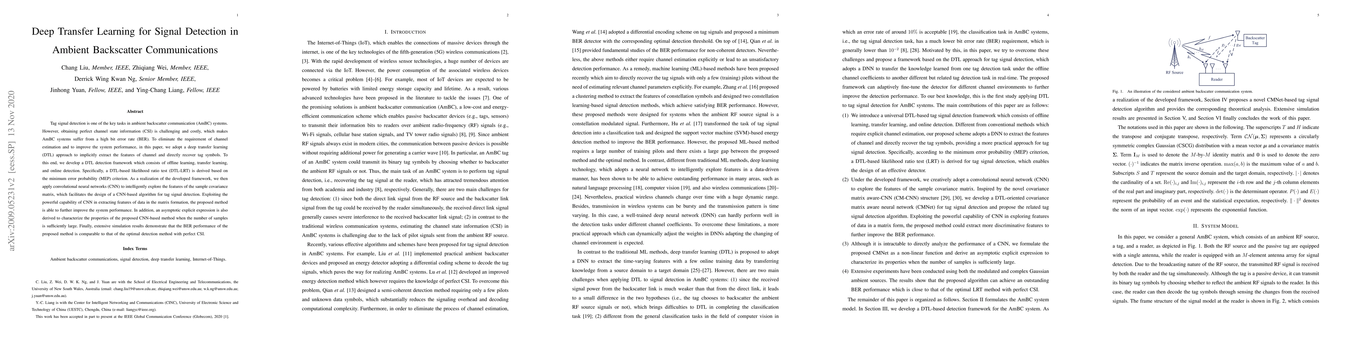 This paper proposes a deep transfer learning (DTL) approach to enhance tag signal detection in ambient backscatter communications, eliminating the need for channel state information and improving system performance. The developed DTL framework uses convolutional neural networks to extract features from the sample covariance matrix, achieving comparable bit error rate performance to optimal methods with perfect channel state information.