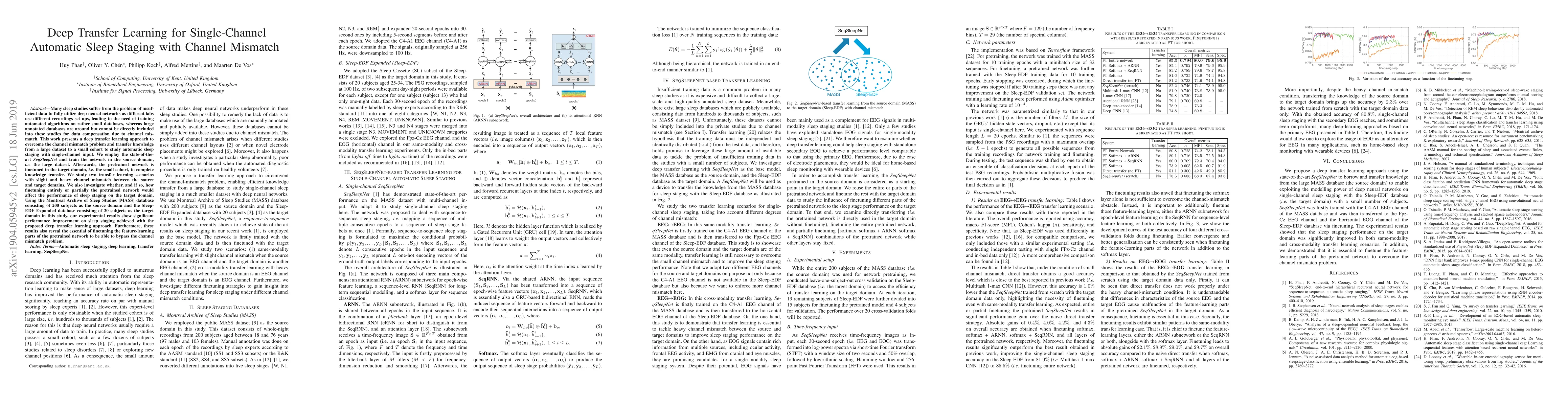 This paper proposes a deep transfer learning method to tackle the channel mismatch problem in small sleep study datasets, leveraging a large annotated dataset for training. By finetuning a pretrained SeqSleepNet model, significant performance gains in automatic sleep staging are achieved, highlighting the importance of finetuning the feature-learning parts of the network.