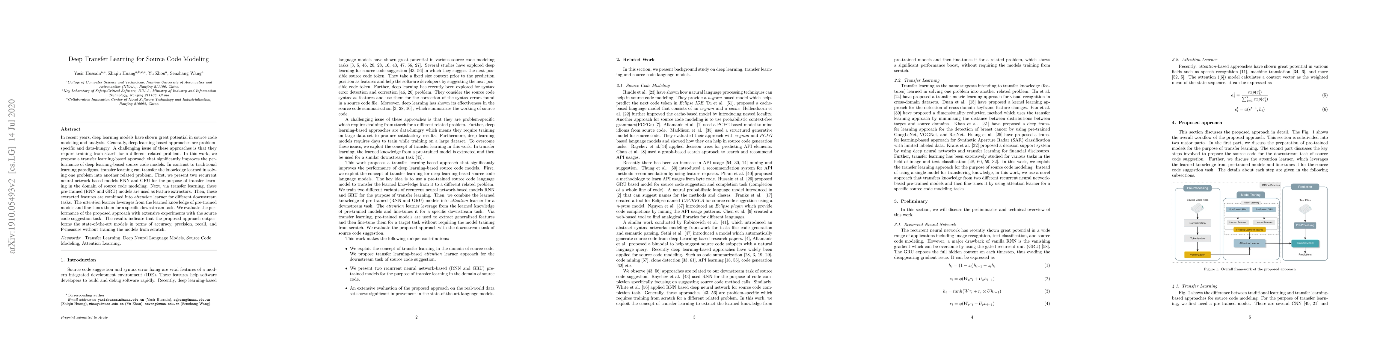 This paper proposes a transfer learning-based approach to improve deep learning models for source code modeling, using RNN and GRU networks for pre-trained feature extraction, followed by an attention learner for specific tasks, achieving better performance than state-of-the-art models without requiring training from scratch.