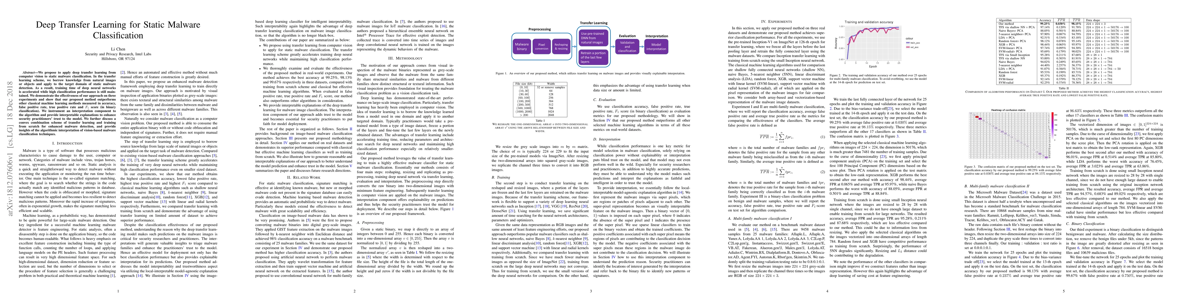 This paper proposes using deep transfer learning from computer vision to improve static malware classification, demonstrating faster training times and higher performance compared to classical methods. It also includes an interpretation component to enhance trust and discusses a combination of transfer learning and training from scratch for better detection.