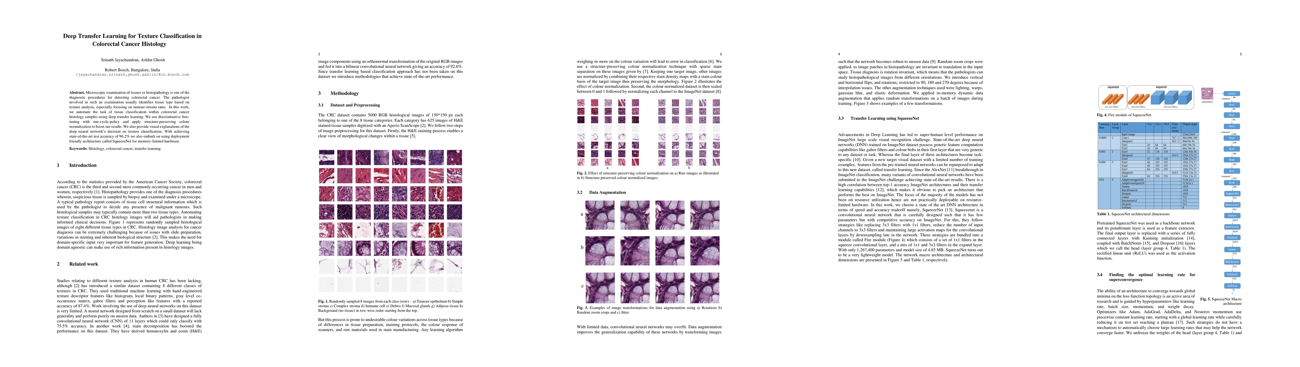 This paper automates colorectal cancer tissue classification in histopathology using deep transfer learning, achieving 96.2% accuracy. It employs SqueezeNet for efficient deployment on memory-limited hardware and provides visual explanations for the neural network's decisions.