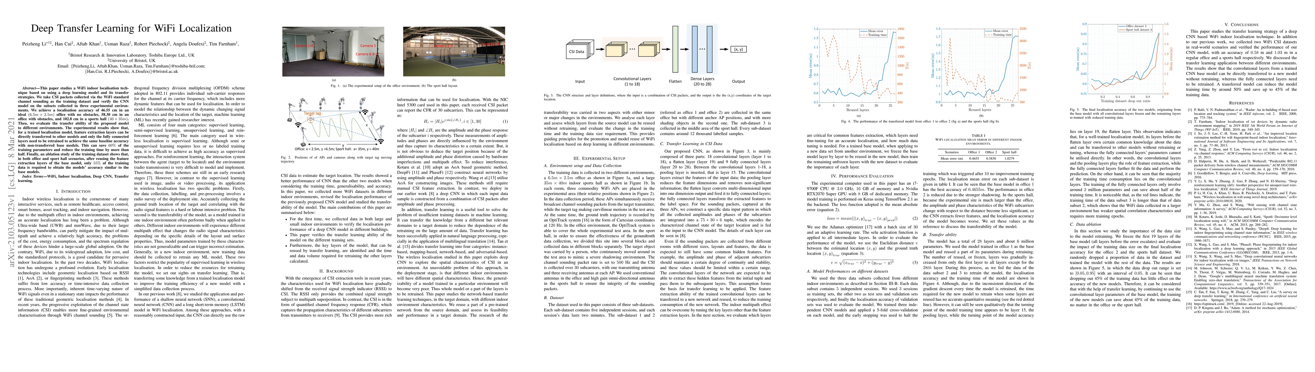 This paper studies a WiFi indoor localisation technique based on using a deep learning model and its transfer strategies. We take CSI packets collected via the WiFi standard channel sounding as the training dataset and verify the CNN model on the subsets collected in three experimental environments. We achieve a localisation accuracy of 46.55 cm in an ideal $(6.5m \times 2.5m)$ office with no obstacles, 58.30 cm in an office with obstacles, and 102.8 cm in a sports hall $(40 \times 35m)$. Then, we evaluate the transfer ability of the proposed model to different environments. The experimental results show that, for a trained localisation model, feature extraction layers can be directly transferred to other models and only the fully connected layers need to be retrained to achieve the same baseline accuracy with non-transferred base models. This can save 60% of the training parameters and reduce the training time by more than half. Finally, an ablation study of the training dataset shows that, in both office and sport hall scenarios, after reusing the feature extraction layers of the base model, only 55% of the training data is required to obtain the models' accuracy similar to the base models.