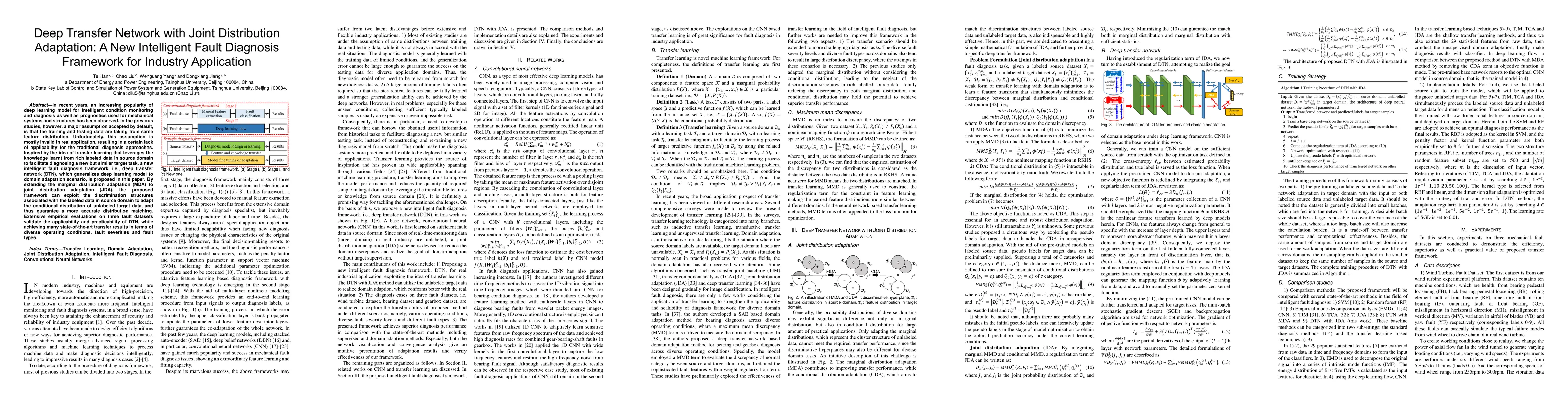 This paper proposes a deep transfer network (DTN) for intelligent fault diagnosis, addressing the issue of domain shift between training and testing data. By extending marginal distribution adaptation to joint distribution adaptation, DTN enhances accuracy and applicability in real-world industrial conditions, validated through state-of-the-art performance on multiple fault datasets.