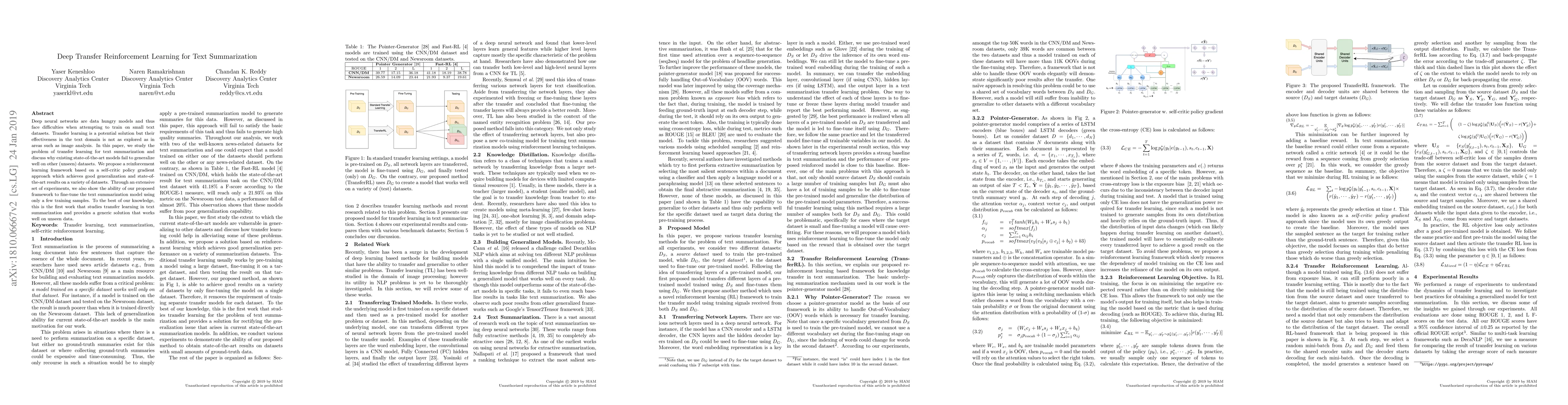 This paper proposes a deep reinforcement learning framework for text summarization that leverages transfer learning to achieve state-of-the-art results and good generalization, even with small datasets. The approach fine-tunes models using few training samples and presents the first study on transfer learning for this task.
